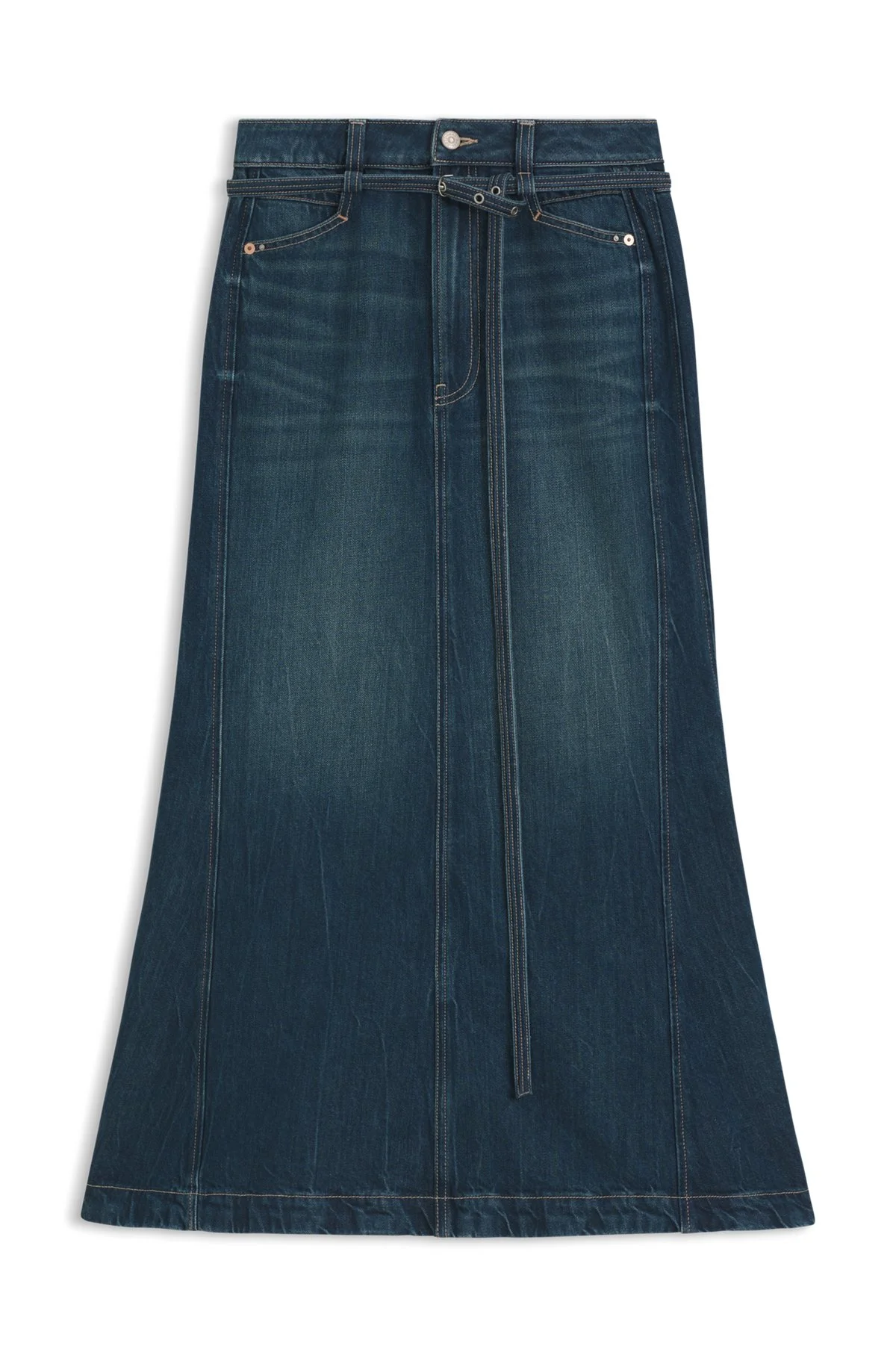 SIZE AND FIT The model wears a size 27 and is 5'11" tall with a, 31" chest, 23" waist and 34" hips. DETAILS With its midi length and flared profile, this BOSS Womenswear skirt creates modern casual looks. Emerald-cast blue denim. Stitching details and detachable belt. Regular fit High rise Button and zip closure Belted closure Pockets bottom front: Side pockets Pockets bottom back: Patch pocket Standard length C_ PEPLUM SKIRT HR - 50548436 QUALITY & CARE INSTRUCTIONS Machine Wash Cold Gentle Quality: 61% Cotton, 39% Lyocell, pocketing: 70% Polyester, 30% Cotton Do Not Tumble Dry Iron Medium Heat Do Not Bleach Do Not Dry Clean