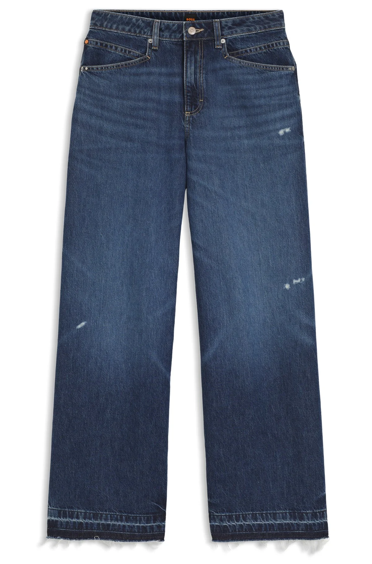 DETAILS Versatile and comfy, these BOSS Womenswear jeans are cut in rigid denim with a fluid feel. Wide-leg, relaxed fit. Rich blue tone. Relaxed fit Mid rise Button and zip closure Pockets bottom front: Side pockets Wide leg Pockets bottom back: Patch pocket Open length C_SLOUCHY MR 1.0 - 50552460 QUALITY & CARE INSTRUCTIONS Do Not Dry Clean Machine Wash Cold Gentle Do Not Bleach Do Not Tumble Dry Iron Medium Heat Material: 60% Cotton, 40% Lyocell, pocketing: 70% Polyester, 30% Cotton