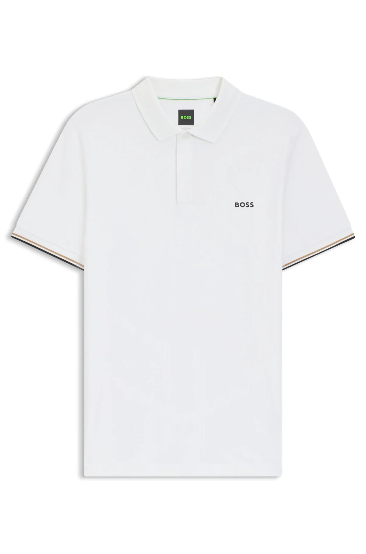 SIZE AND FIT The model wears a size M and is 6'2" tall with a, 38" chest, 29" waist and 38" hips. DETAILS Cut in bodymapping jersey with quick-dry performance, this regular BOSS Menswear polo shirt will upgrade any casual look. Contrast logo print. Signature cuff stripes. Regular fit Neckline: Flat-knit collar Number of buttons: 3 Short sleeves Flat-knit cuffs Standard length PL_GOC Chip Hexa - 50554561 QUALITY & CARE INSTRUCTIONS Do Not Tumble Dry Machine Wash Cold Gentle Do Not Dry Clean Material: 93% Polyester, 7% Elastane Iron Low Heat Do Not Bleach