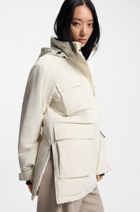 SIZE AND FIT The model wears a size S and is 5'9" tall with a, 31" chest, 23" waist and 35" hips. DETAILS In two-layered fabric with a water-repellent finish, this women's BOSS Ski jacket keeps the elements at bay. Adjustable cuffs. Regular fit. Lightweight wadding. Take to the mountains in style with BOSS Ski: a collection of high-performance pieces and bold apres-ski designs. Regular fit Hooded collar Stand collar Fastening top: Press-stud closure Number of buttons: 4 or more buttons Patch chest pockets Pockets top: Patch pockets Standard length Reni_SKI - 50544369 QUALITY & CARE INSTRUCTIONS Do Not Dry Clean Do Not Wash Material: 84% Polyamid, 16% Elastane, Lining: 100% Polyester, Cuff: 85% Polyamid, 15% Elastane, pocketing: 100% Polyester, Wadding: 100% Polyester very mild professional wet clean Do Not Tumble Dry Do Not Bleach Iron Low Heat