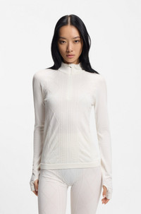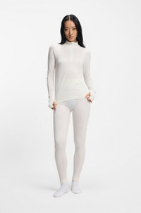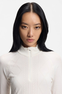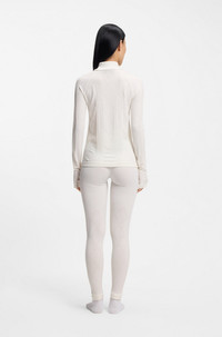 SIZE AND FIT The model wears a size S and is 5'9" tall with a, 31" chest, 23" waist and 35" hips. DETAILS In a wool-blend jersey knit, this slim-fit women's BOSS Ski top is an insulating-yet-breathable base layer for wearing under ski suits or simply relaxing in. With a zip neckline and thumbholes. Take to the mountains in style with BOSS Ski: a collection of high-performance pieces and bold apres-ski designs. Slim fit Neckline: Stand collar Fastening top: Zip closure Long sleeves Standard length Eskinno_SKI - 50544394 QUALITY & CARE INSTRUCTIONS Material: 50% Wool, 47% Polyamid, 3% Elastane Do Not Tumble Dry Do Not Bleach Iron Low Heat Cold, gentle machine wash; reduced spin speed. Do Not Dry Clean