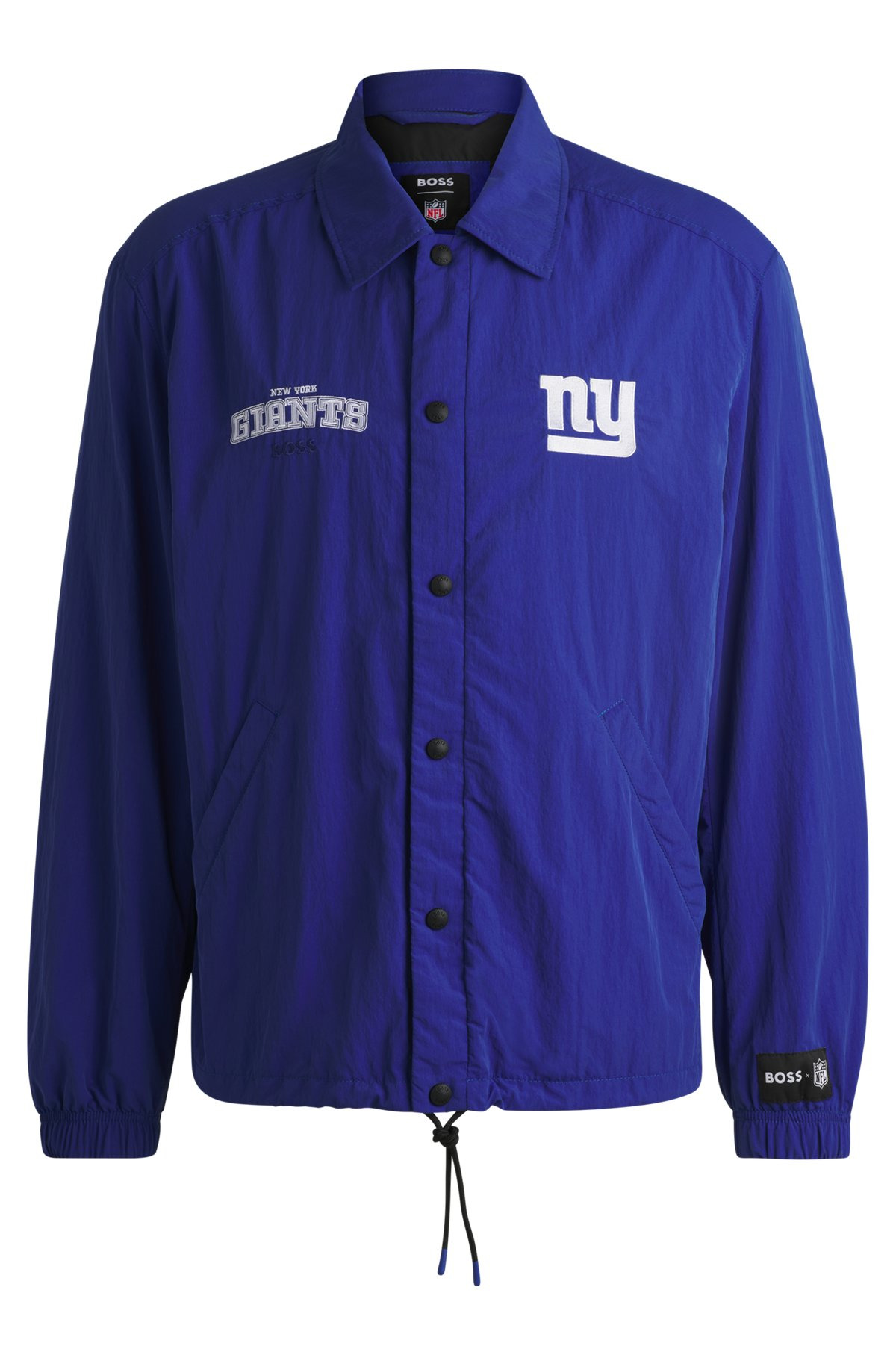 SIZE AND FIT The model wears a size M and is 6'2" tall with a, 38" chest, 30" waist and 35" hips. DETAILS Otto_NFL - 50531016 A fully lined coach jacket by BOSS. Featuring embroidered branding and special trims, this lightweight piece is crafted in peached water-repellent fabric. BOSS x NFL is a limited capsule that spotlights 22 popular NFL teams, celebrating the lifelong commitments that their players and fanbase make. Stand collar Number of buttons: 4 or more buttons Pockets top: Welt pockets Fully lined Fit back length: 72 cm (28 inches) QUALITY & CARE INSTRUCTIONS Do Not Bleach Do Not Tumble Dry Do Not Dry Clean Iron Low Heat Machine Wash Cold Gentle Quality: 100% Polyamid, Lining: 100% Polyamid