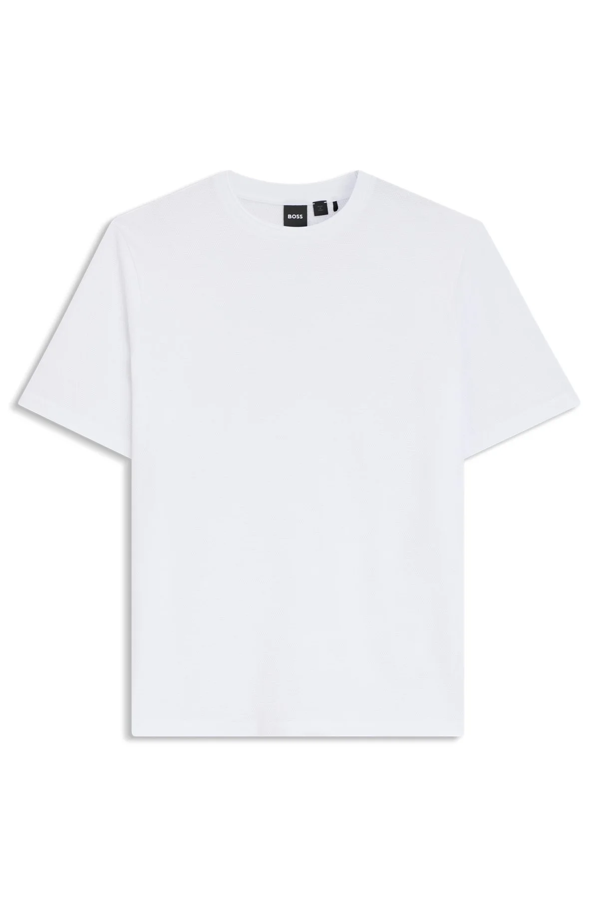 DETAILS A crew-neck T-shirt by BOSS Menswear, featuring a bubble structure created with a jacquard technique. Styled with a regular fit, this short-sleeved piece is crafted in a cotton blend and simply detailed with a ribbed-cotton collar and a logo flag at the side seam. The mouline yarn gives this T-shirt a distinctive effect. Regular fit Neckline: Crew neck Short sleeves BT-Tiburt 240 - 50559635 QUALITY & CARE INSTRUCTIONS Machine Wash Cold Gentle Do Not Bleach Do Not Tumble Dry Material: 75% Cotton, 25% Polyester Do Not Dry Clean Iron Low Heat