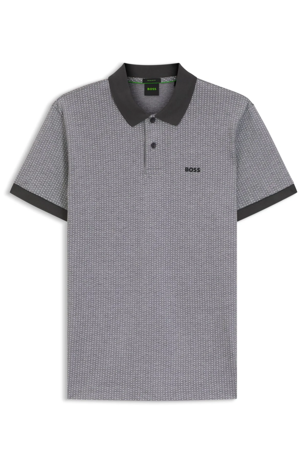 DETAILS Polo TL - 50544482 With a logo and collar stripe, this regular-fit BOSS Menswear polo shirt injects fresh energy into casual looks. Breathable cotton pique with dot print. Regular fit Neckline: Flat-knit collar Number of buttons: 2 Short sleeves Flat-knit cuffs Standard length QUALITY & CARE INSTRUCTIONS Iron Low Heat Do Not Tumble Dry Quality: 100% Cotton Do Not Bleach Do Not Dry Clean Machine Wash Cold Gentle