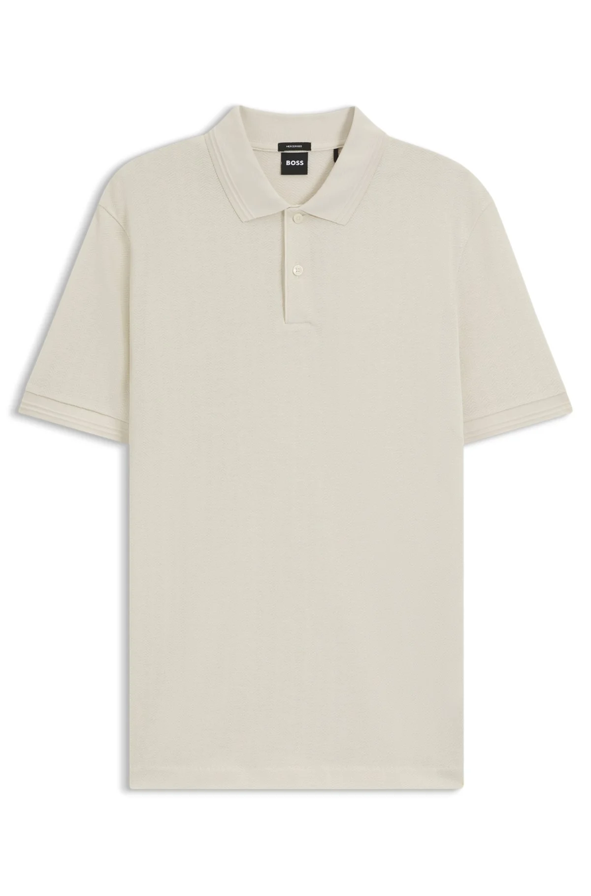 DETAILS In breathable cotton with a wintry herringbone weave, this regular BOSS Menswear polo shirt makes a modern casual statement. 3D stripe on collar. Regular fit Neckline: Polo collar Number of buttons: 2 Short sleeves Flat-knit cuffs Side slit C-Parlay 240 - 50549593 QUALITY & CARE INSTRUCTIONS Do Not Tumble Dry Iron Low Heat Machine Wash Cold Gentle Do Not Bleach Reduced Dry Clean Quality: 100% Cotton