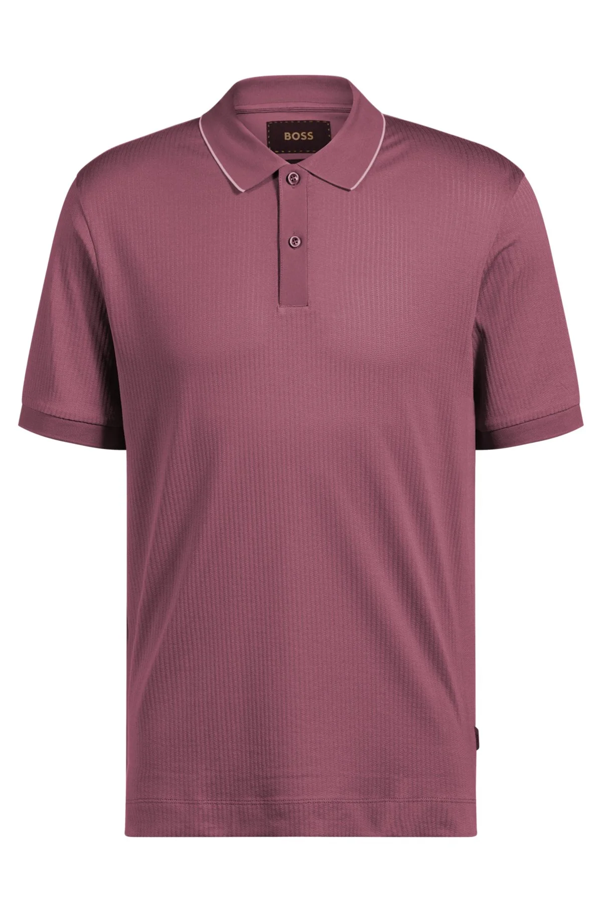 SIZE AND FIT The model wears a size M and is 6'1" tall with a, 36" chest, 29" waist and 37" hips. DETAILS L-Perry 57 - 50537207 With a richly structured stripe, this BOSS Menswear polo shirt has an easy regular fit. Soft cotton blended with silk for a luxurious touch. Regular fit Short sleeves QUALITY & CARE INSTRUCTIONS Quality: 85% Cotton, 15% Silk Do Not Tumble Dry Hand Wash Only Do Not Bleach Reduced Dry Clean Iron Low Heat