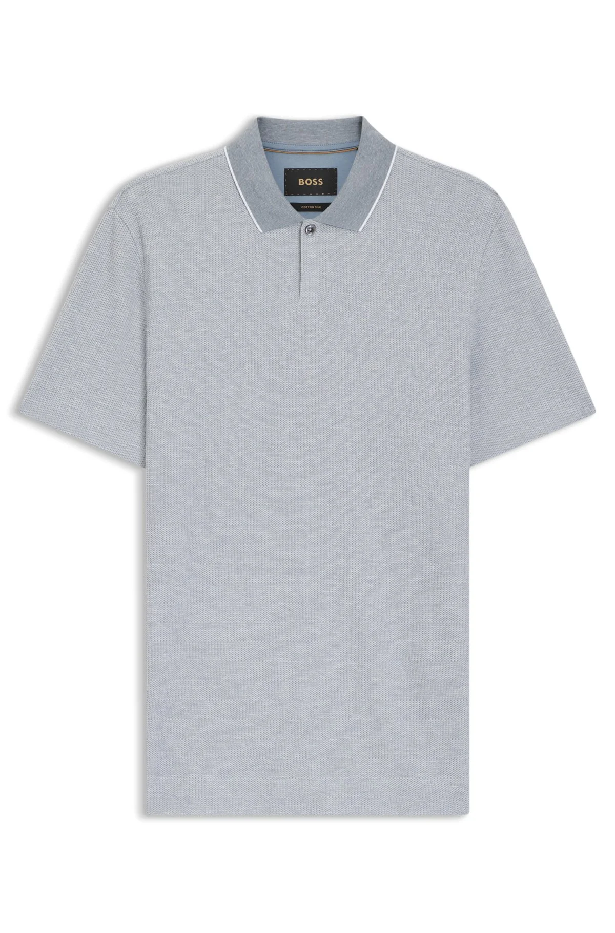 SIZE AND FIT The model wears a size M and is 6'1" tall with a, 36" chest, 29" waist and 36" hips. DETAILS Combining a rich structure with a solid, tipped collar, this BOSS Menswear polo shirt will elevate everyday looks. Regular fit Luxe cotton-silk. Regular fit Neckline: Polo collar Number of buttons: 2 Short sleeves Side slit Standard length L-Pointy 124 - 50554833 QUALITY & CARE INSTRUCTIONS Do Not Bleach Do Not Tumble Dry Iron Low Heat Material: 94% Cotton, 6% Silk Reduced Dry Clean Hand Wash Only