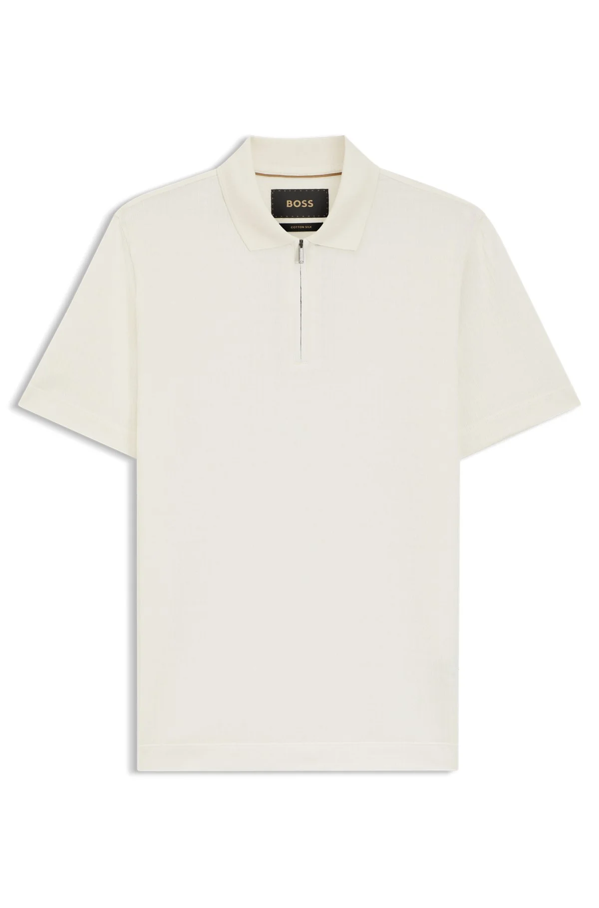DETAILS In a mercerized cotton-silk, this regular-fit BOSS Menswear polo shirt is an elevated casual option. Zip placket. Geometric jacquard. Regular fit Neckline: Polo collar Short sleeves Side slit L-Payrot 125 - 50555939 QUALITY & CARE INSTRUCTIONS Do Not Bleach Do Not Tumble Dry Material: 72% Cotton, 28% Silk Reduced Dry Clean Hand Wash Only Iron Low Heat