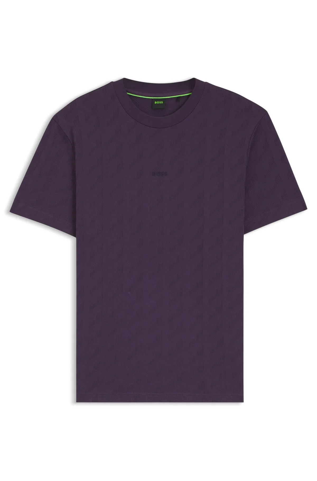 SIZE AND FIT The model wears a size L and is 6'2" tall with a, 41" chest, 33" waist and 40" hips. DETAILS Refresh casual looks with the dynamic jacquard pattern of this relaxed BOSS Menswear T-shirt. Moisture-managing cotton jersey. Subtle logo detail. Relaxed fit Neckline: Crew neck Short sleeves Standard length TS_Mirror Artwork - 50548649 QUALITY & CARE INSTRUCTIONS Do Not Dry Clean Do Not Tumble Dry Material: 100% Cotton, Collar: 98% Cotton, 2% Elastane Iron Low Heat Do Not Bleach Machine Wash Cold Gentle