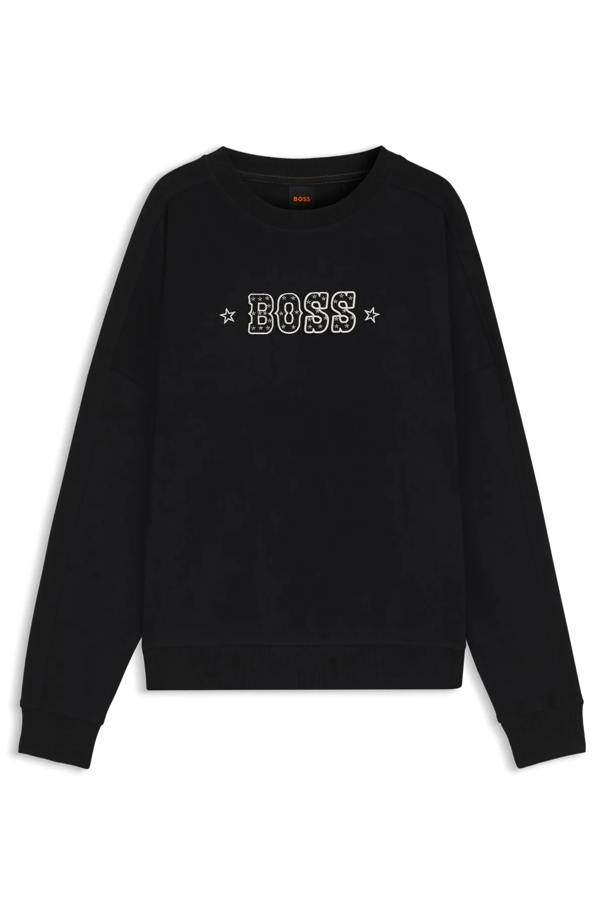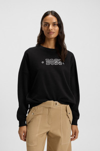 DETAILS C_Eland_1 - 50546961 Detailed with fresh logo artwork, this BOSS Womenswear sweatshirt is essential for casual layering. Comfortable oversize fit with dropped shoulders. Soft French-terry cotton. Oversized fit Neckline: Crew neck Long sleeves Ribbed cuffs Standard length QUALITY & CARE INSTRUCTIONS Do Not Tumble Dry Machine Wash Cold Gentle Iron Low Heat Quality: 100% Cotton, Ribbing: 97% Cotton, 3% Elastane, Insert: 100% Cotton Do Not Bleach Do Not Dry Clean