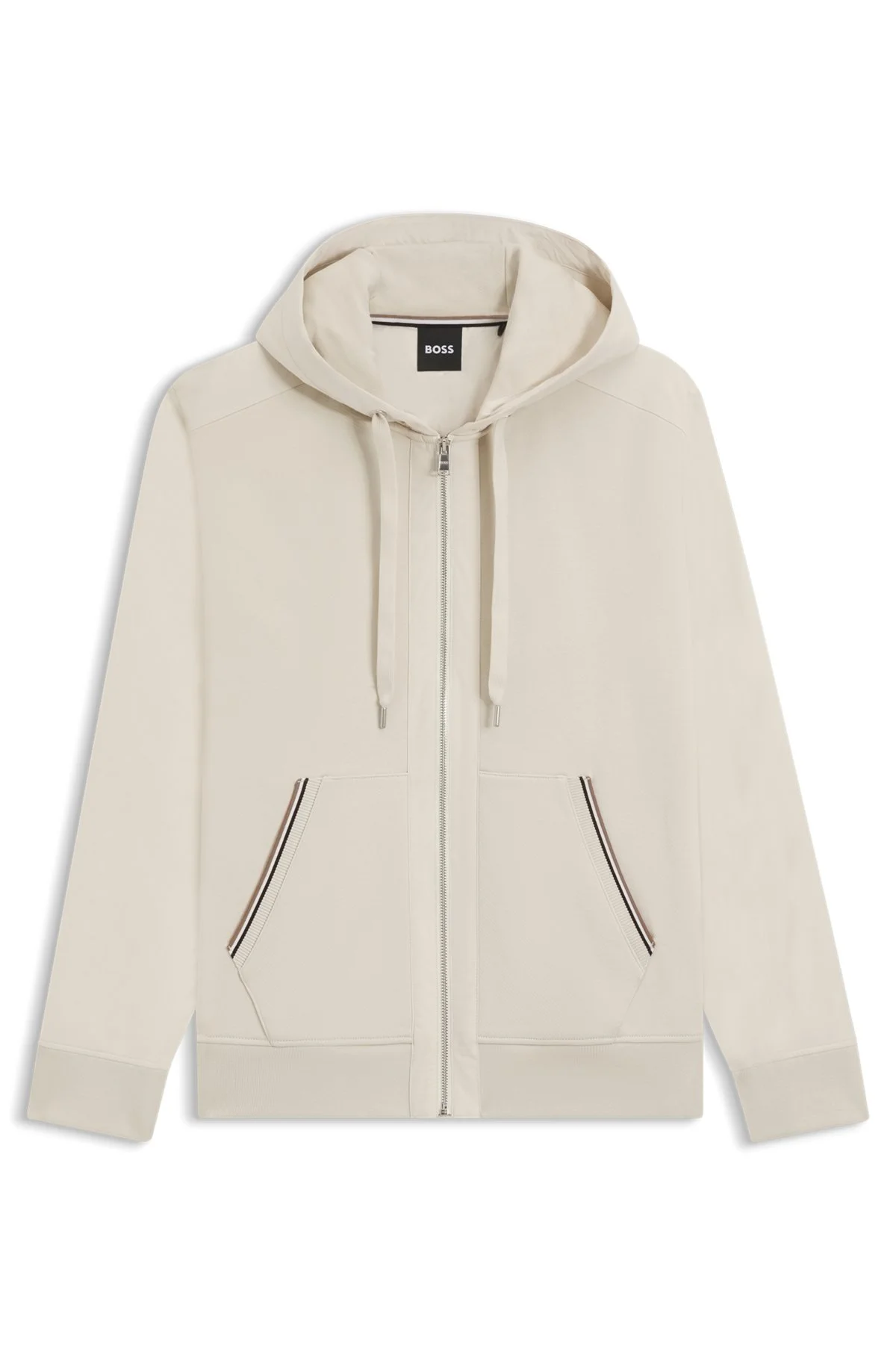 SIZE AND FIT The model wears a size M and is 6'1" tall with a, 36" chest, 29" waist and 36" hips. DETAILS With its signature-stripe pocket trims and soft cotton terry, this wadded BOSS Menswear hoodie is great for casual layering. Regular fit Regular fit Neckline: Hooded Fastening top: Zip closure Long sleeves Flat-knit cuffs Standard length C-Spence 10 - 50555115 QUALITY & CARE INSTRUCTIONS Machine Wash Cold Gentle Do Not Bleach Do Not Tumble Dry Material: 100% Cotton, Lining: 100% Polyester, Components: 100% Elastomultiester, Wadding: 100% Polyester Do Not Dry Clean Iron Low Heat
