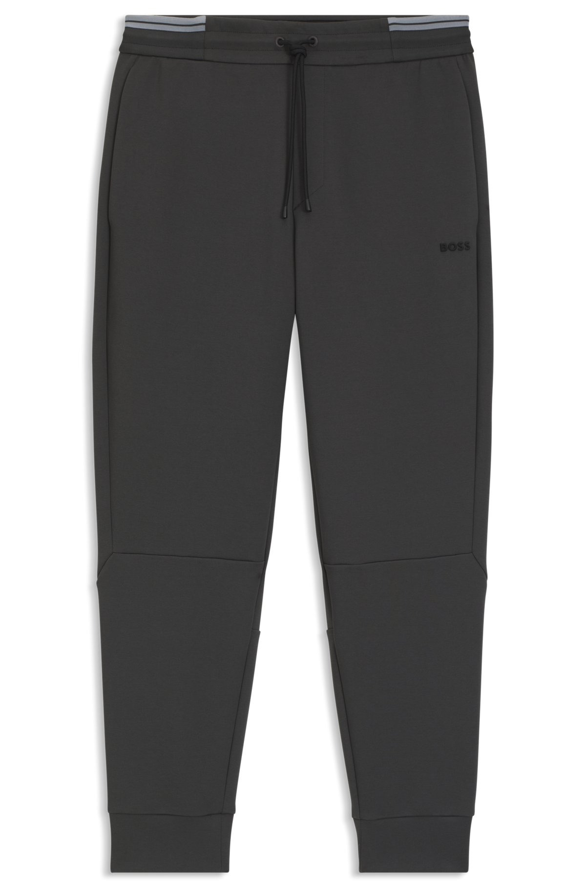 DETAILS Pants Zone - 50543070 Featuring a molded logo and sporty stripes, these regular-fit BOSS Menswear tracksuit bottoms are an easy building block. Cotton with stretch. Cuffed hems. Regular fit Regular rise Drawstring Pockets bottom front: Side pockets Pockets bottom back: Welt pocket QUALITY & CARE INSTRUCTIONS Do Not Tumble Dry Machine Wash Cold Gentle Iron Low Heat Quality: 62% Cotton, 33% Polyester, 5% Elastane, pocketing: 100% Polyester Do Not Bleach Do Not Dry Clean