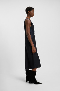 SIZE AND FIT The model wears a size 4 and is 5'8" tall with a, 29" chest, 22" waist and 35" hips. DETAILS C_DICLAN - 50544019 Crafted in drapey crinkle satin, this BOSS Womenswear dress is an elegant day-to-evening option. Gathered front and rear Georgette detailing. Fit back length: 115 cm (45 inches) QUALITY & CARE INSTRUCTIONS Reduced Dry Clean Machine Wash Cold Gentle Quality: 97% Polyester, 3% Elastane, upper part: 100% Polyester Do Not Tumble Dry Do Not Bleach Iron Low Heat