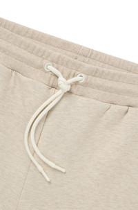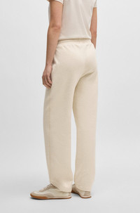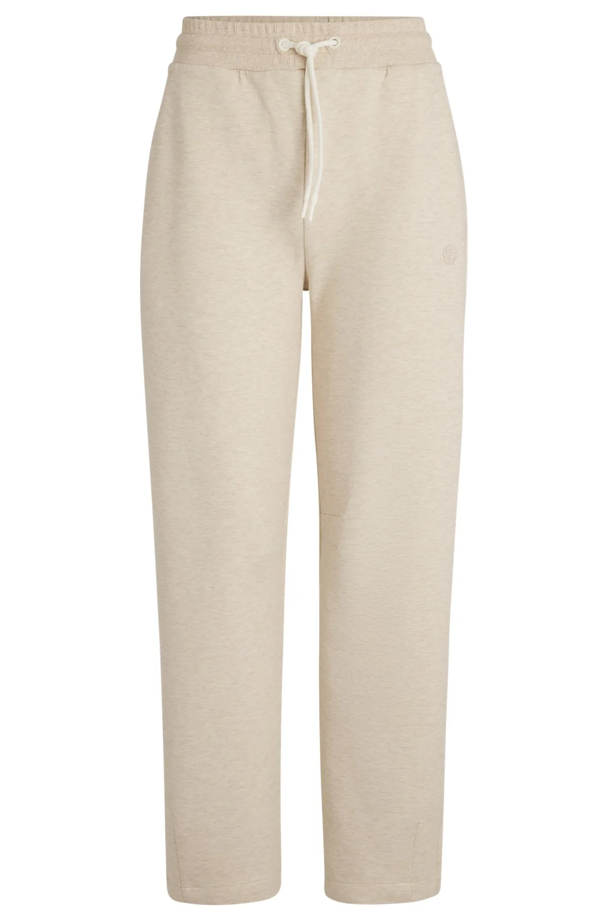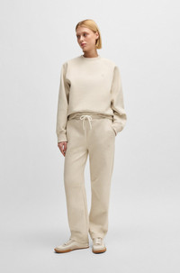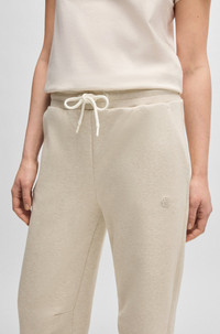 SIZE AND FIT The model wears a size S and is 5'9" tall with a, 31" chest, 24" waist and 35" hips. DETAILS Evren - 50537486 Crafted in a melange cotton for comfort, these BOSS Womenswear tracksuit bottoms have a modern cropped length. Trimmed with a Double B monogram. Regular rise Elastic Waistband Pockets bottom front: Side pockets Unlined Fit foot width: 19,0 cm (7.5 inches) QUALITY & CARE INSTRUCTIONS Do Not Tumble Dry Do Not Bleach Machine Wash Cold Gentle Quality: 82% Cotton, 14% Polyester, 4% Elastane Do Not Dry Clean Iron Low Heat