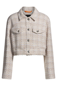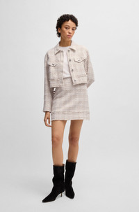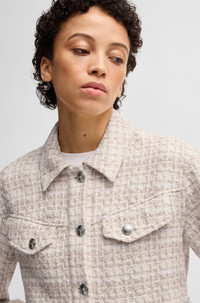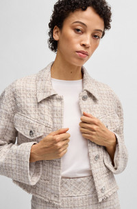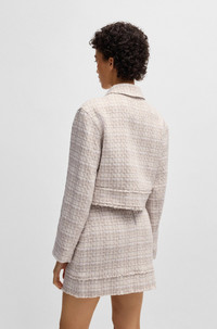 SIZE AND FIT The model wears a size 4 and is 5'10" tall with a, 31" chest, 24" waist and 35" hips. DETAILS C_Jafresi - 50537051 Blended with cotton, this modern BOSS Womenswear jacket has a cropped length and logo-detail buttons. Create a chic set with the matching skirt. Fit back length: 47 cm (19 inches) QUALITY & CARE INSTRUCTIONS Do Not Bleach Reduced Dry Clean Quality: 49% Polyester, 34% Polyacrylic, 12% Cotton, 5% Other fibres, Lining: 100% Viscose Iron Low Heat Do Not Wash Do Not Tumble Dry