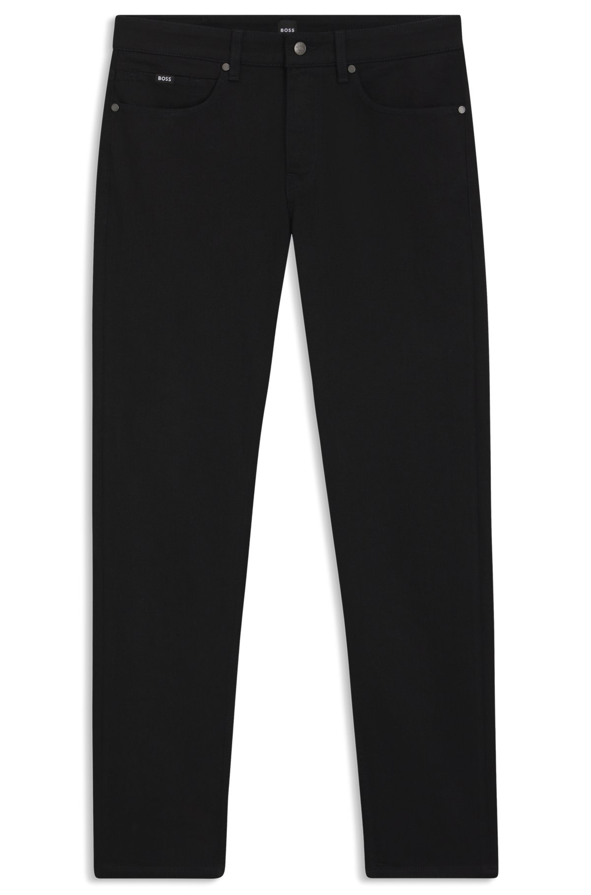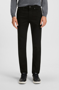 SIZE AND FIT The model wears a size 32/32 and is 6'1" tall with a, 0" chest, 31" waist and 37" hips. DETAILS H-Delaware - 50520837 Slim-fitting jeans in brushed Italian denim by BOSS Menswear. This regular-rise pair in deep black is detailed with signature trims. Slim fit Regular rise Button and zip closure Pockets bottom front: Side pockets Slim leg Pockets bottom back: Patch pocket Standard length Fit foot width: 35,4 cm (13.9 inches) QUALITY & CARE INSTRUCTIONS Iron Medium Heat Do Not Tumble Dry Do Not Bleach Do Not Dry Clean Machine Wash Cold Gentle Quality: 92% Cotton, 6% Elastomultiester, 2% Elastane