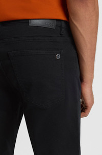 SIZE AND FIT The model wears a size 32/32 and is 6'1" tall with a, 33" chest, 26" waist and 35" hips. DETAILS DELAWARE BO - 50521261 Slim-fitting jeans with an intense, lasting shade of black by BOSS Menswear. This regular-rise pair is crafted in comfort-stretch denim for easy movement. Slim fit Regular rise Button and zip closure Pockets bottom front: Side pockets Slim leg Pockets bottom back: Patch pocket Standard length Fit foot width: 36,0 cm (14.2 inches) QUALITY & CARE INSTRUCTIONS Iron Medium Heat Do Not Tumble Dry Do Not Bleach Quality: 99% Cotton, 1% Elastane Machine Wash Cold Gentle Do Not Dry Clean