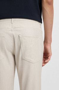 DETAILS P-Delaware5 - 50543954 Offering dependable wrinkle resistance, these BOSS Menswear trousers are so easy to style. Clean fit in stretch dobby for dynamic flexibility. Slim fit Regular rise Button and zip closure Slim leg Pockets bottom front: Side pockets Pockets bottom back: Patch pocket QUALITY & CARE INSTRUCTIONS Do Not Bleach Machine Wash Cold Gentle Do Not Tumble Dry Do Not Dry Clean Quality: 75% Polyester, 21% Viscose, 4% Elastane, pocketing: 65% Polyester, 35% Cotton Iron Medium Heat