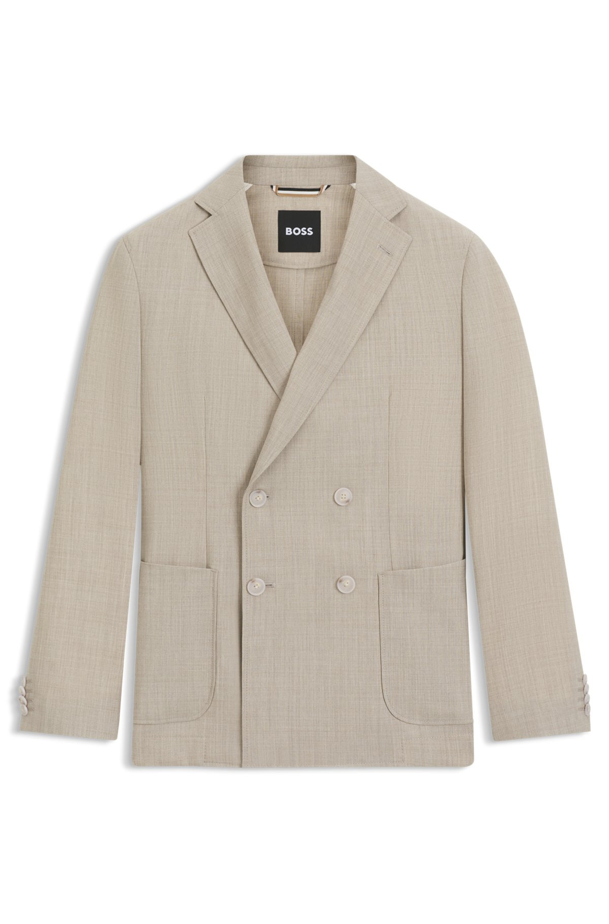 SIZE AND FIT The model wears a size 38R and is 6'1" tall with a, 33" chest, 24" waist and 36" hips. DETAILS C-Hanry-DB-254 - 50553881 Woven with a subtle pattern, this BOSS Menswear blazer is simple to style. Unisex suit in wool with natural stretch Double-breasted Patch pockets Unlined QUALITY & CARE INSTRUCTIONS Reduced Dry Clean Do Not Bleach Do Not Tumble Dry Do Not Wash Iron Low Heat Quality: 100% Virgin wool, Lining: 65% Polyester, 35% Cotton, Sleeve lining: 100% Viscose