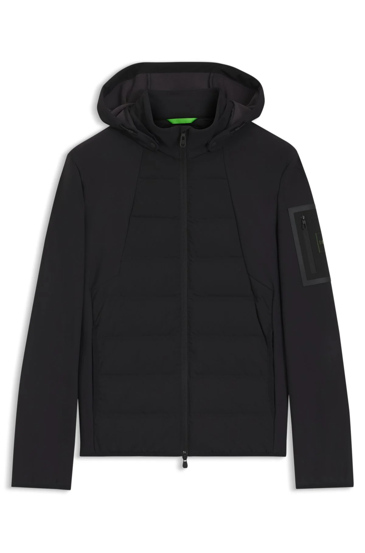 SIZE AND FIT Regular fit The model wears a size L and is 6'1" tall with a, 36" chest, 29" waist and 37" hips. DETAILS Stay cozy and dry with the certified down filling and water-repellent finish of this regular-fit BOSS Menswear jacket. Zipped sleeve pocket with logo. Regular fit Detachable hood Fastening top: Zip closure Pockets top: Side-entry pockets Elasticized cuffs Standard length Fit back length: 69 cm (27 inches) OW_T-Down HY HD 1 - 50551095 QUALITY & CARE INSTRUCTIONS Iron Low Heat Do Not Wash Material: 53% Polyester, 40% Polyamid, 7% Elastane, Lining: 100% Polyamid, Filling: 80% Duck down, 20% Duck Feather, Front panel: 100% Polyester Do Not Bleach very mild professional wet clean Do Not Tumble Dry Do Not Dry Clean