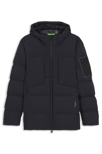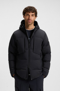 SIZE AND FIT The model wears a size M and is 6'0" tall with a, 38" chest, 30" waist and 37" hips. DETAILS Filled with certified duck down and feather, this water-repellent BOSS Menswear parka is a must on chilly days. Windshield and binding on hood. Regular fit Hooded collar Fastening top: Zip closure Zip chest pockets Pockets top: Zip pockets Inside patch pockets Fully lined Standard length Fit back length: 76 cm (30 inches) OW_Riplite Puffer HD - 50543963 QUALITY & CARE INSTRUCTIONS Tumble Dry Low Heat Iron Low Heat Do Not Dry Clean Do Not Wash Do Not Bleach Material: 100% Polyamid, Lining: 100% Polyamid, Filling: 80% Duck down, 20% Duck Feather, lining yoke: 100% Polyamid very mild professional wet clean