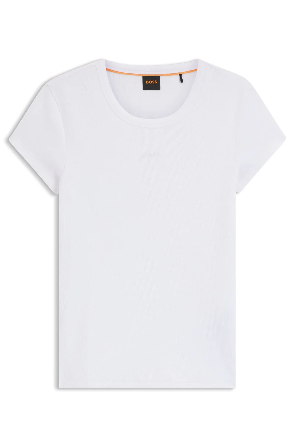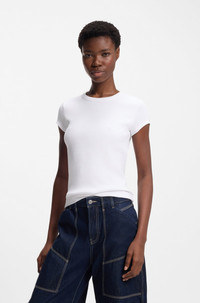 DETAILS Ideal for everyday casuals, this BOSS Womenswear T-shirt combines a slim cut with elegant cap sleeves. Soft stretch cotton. Embroidered handwritten logo. Slim fit Neckline: Crew neck Cap sleeves Standard length C_Ecute - 50554675 QUALITY & CARE INSTRUCTIONS Machine Wash Cold Gentle Do Not Bleach Do Not Tumble Dry Material: 98% Cotton, 2% Elastane, Ribbing: 97% Cotton, 3% Elastane Iron Low Heat Reduced Dry Clean