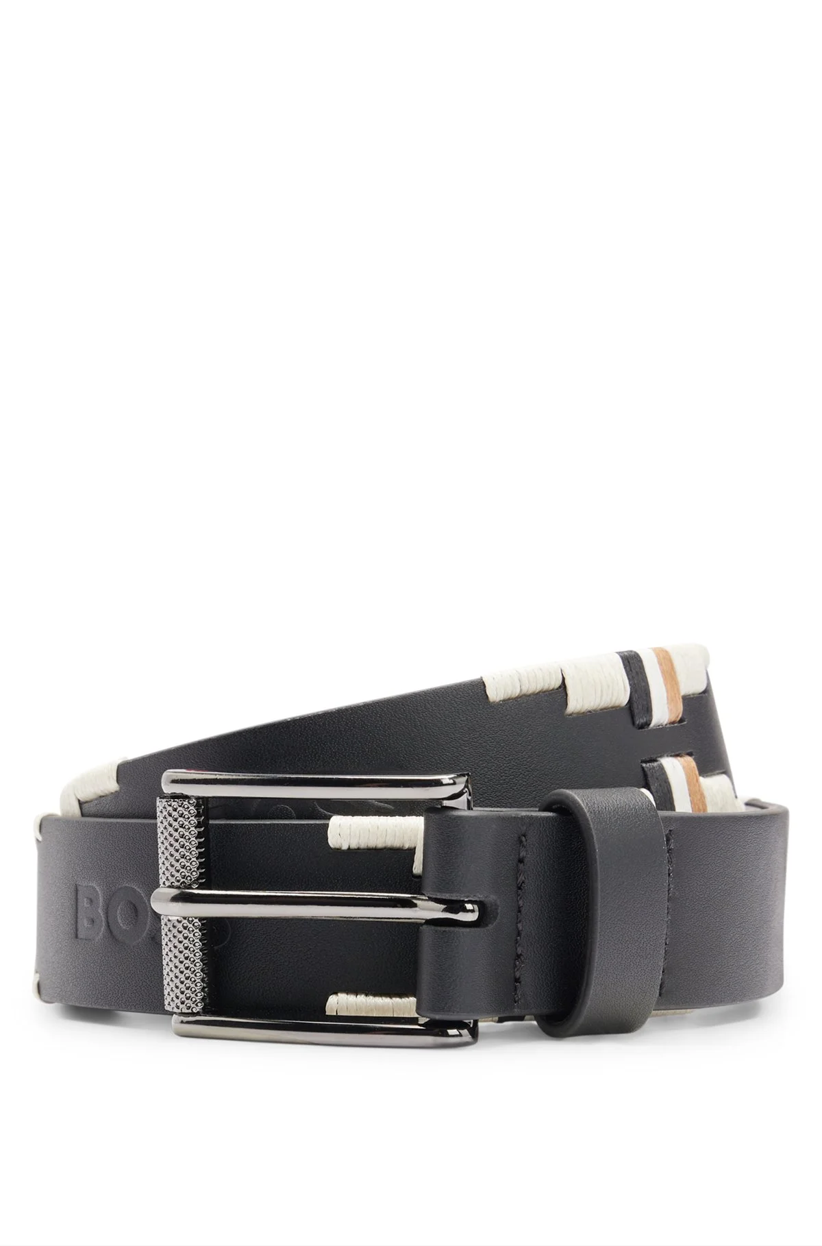 SIZE AND FIT The model wears a size 34 and is 5'9" tall with a, 29" chest, 24" waist and 35" hips. DETAILS POLO BELT SIGNATURE BLACK - B1G2201 A 3.5cm belt crafted in finest leather by BOSS. Featuring embossed logos along the strap, this belt is hand embroidered with signature-stripe accents. A milled-roller buckle completes this accessory. QUALITY & CARE INSTRUCTIONS Do Not Dry Clean Do Not Tumble Dry Quality: 100% Leather Do Not Wash Do Not Bleach Do Not Iron