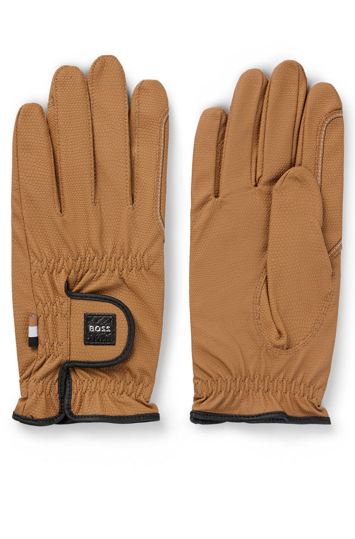 DETAILS Machine-washable riding gloves by BOSS. Made in synthetic coated fabric that offers an unbeatable grip and long-lasting comfort, these riding gloves have a riptape closure for a close and secure fit. Branded details add a timeless finish to this expertly crafted pair. Synthetic coated fabric, sometimes referred to as faux leather, is a fabric designed to resemble real leather, and/or display a matte, glossy, smooth, or textured, coated appearance. RIDING GLOVES HYBRID - B4U2302 QUALITY & CARE INSTRUCTIONS Machine Wash Cold Gentle Quality: 100% Polyester Do Not Iron Do Not Tumble Dry Do Not Bleach Do Not Dry Clean