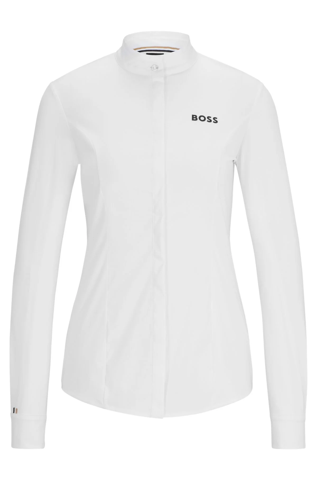 SIZE AND FIT The model wears a size S and is 5'9" tall with a, 29" chest, 24" waist and 35" hips. DETAILS EMMA SHOW BLOUSE WHITE - B1W0401 A form-fitting show blouse by BOSS Womenswear. Featuring Viennese seam work for a flattering effect, this slim-cut show blouse is crafted in a combination of and super-stretch material for total freedom of movement. A double collar and contrast branding complete this elegant piece. QUALITY & CARE INSTRUCTIONS Do Not Dry Clean Do Not Tumble Dry Machine Wash Cold Gentle Quality: 75% Polyamid, 25% Elastane Do Not Bleach Do Not Iron