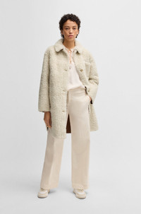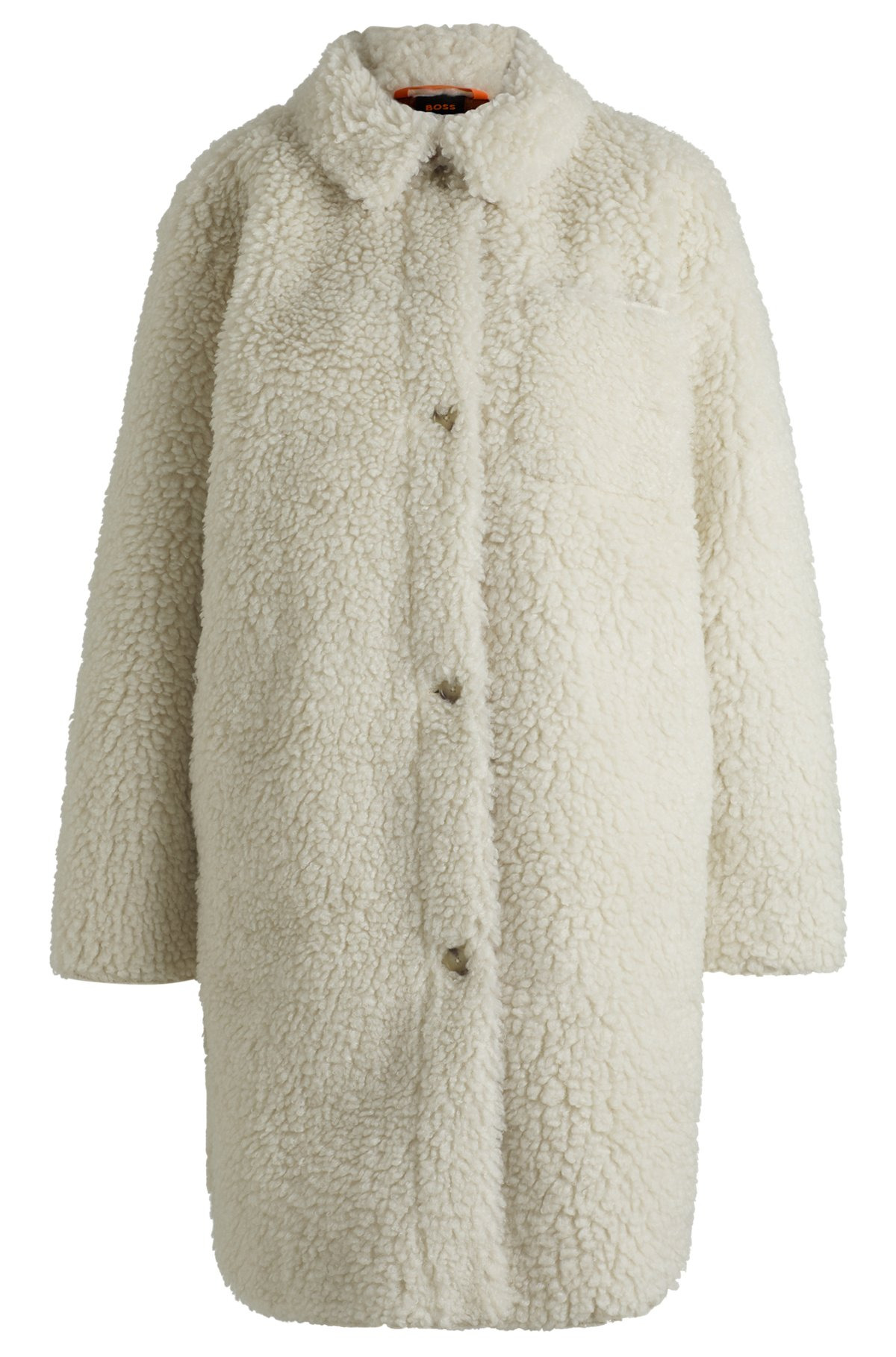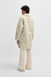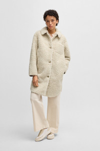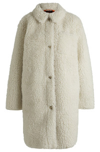 SIZE AND FIT The model wears a size 4 and is 5'10" tall with a, 31" chest, 24" waist and 35" hips. DETAILS C_Coteddy - 50519075 A distinctive coat by BOSS. This elegant piece is crafted in faux fur with a plush feel and features a chest pocket. QUALITY & CARE INSTRUCTIONS Do Not Bleach Do Not Tumble Dry Quality: 100% Polyester, Components: 100% Polyester Wash Do Not Dry Clean Iron Low Heat Machine Wash Cold Gentle
