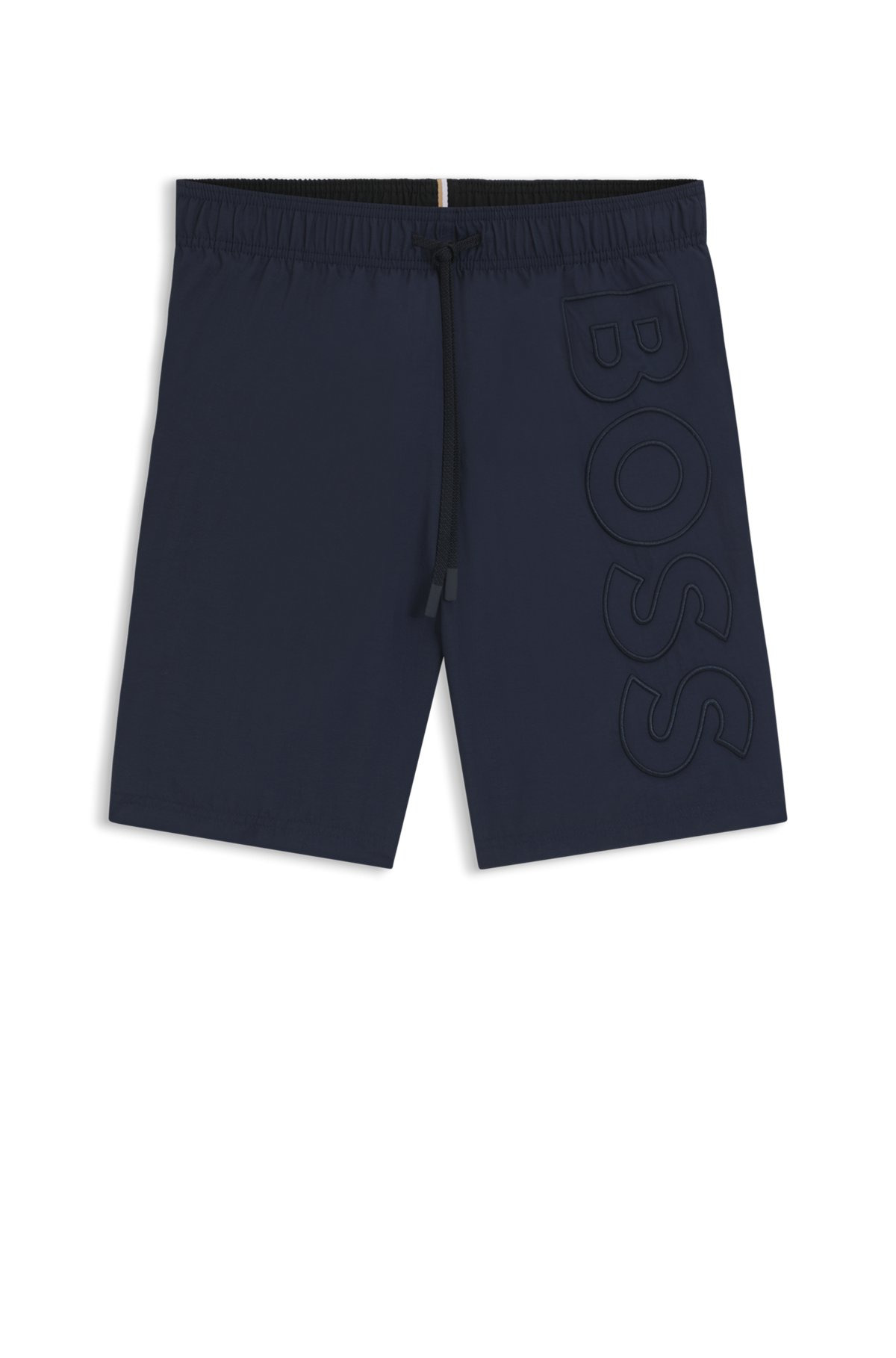 SIZE AND FIT The model wears a size M and is 6'2" tall with a, 0" chest, 28" waist and 36" hips. DETAILS Whale - 50469329 Fully lined swim shorts with a patterned drawcord by BOSS. This pair is detailed with a 3D embroidered logo on the left leg. Elastic waistband Drawstring Pockets bottom front: Side pockets Pockets bottom back: Patch pocket Long length QUALITY & CARE INSTRUCTIONS Do Not Bleach Do Not Tumble Dry Machine Wash Cold Quality: 100% Polyamide, Lining: 100% Polyester Do Not Iron Do Not Dry Clean