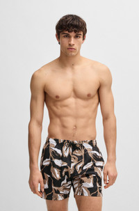 SIZE AND FIT The model wears a size M and is 6'2" tall with a, 37" chest, 29" waist and 37" hips. DETAILS Piranha - 50508844 Statement swim shorts by BOSS. This fully lined pair features a seasonal print, a logo label and an elasticated waistband. QUALITY & CARE INSTRUCTIONS Do Not Dry Clean Do Not Tumble Dry Do Not Bleach Quality: 100% Polyester, Lining: 100% Polyester Machine Wash Cold Do Not Iron