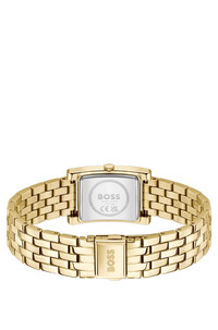 DETAILS LUCY QTM - 58201176 Hand polished in gold-tone steel, the case of this BOSS Womenswear watch has a modern square profile. Green dial with sunray brushing. Watch mechanism: Two-hand Dial color: green Strap material: Stainless steel Closure: Push-button deployment Water Resistance (in ATM): 3 ATM QUALITY & CARE INSTRUCTIONS Quality: 100% Stainless steel
