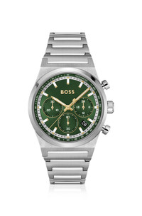 DETAILS CANDOR CHRONO - 58244865 With an improved comfort fit on the link bracelet, this BOSS Menswear watch is ideal for everyday wear. Green brushed dial with multiple subeyes. Watch mechanism: Chronograph Dial color: green Strap material: Stainless steel Closure: Push-button deployment Case size: 1.61 in (41 mm) (0 inches) Water Resistance (in ATM): 5 ATM QUALITY & CARE INSTRUCTIONS Quality: 100% Stainless steel