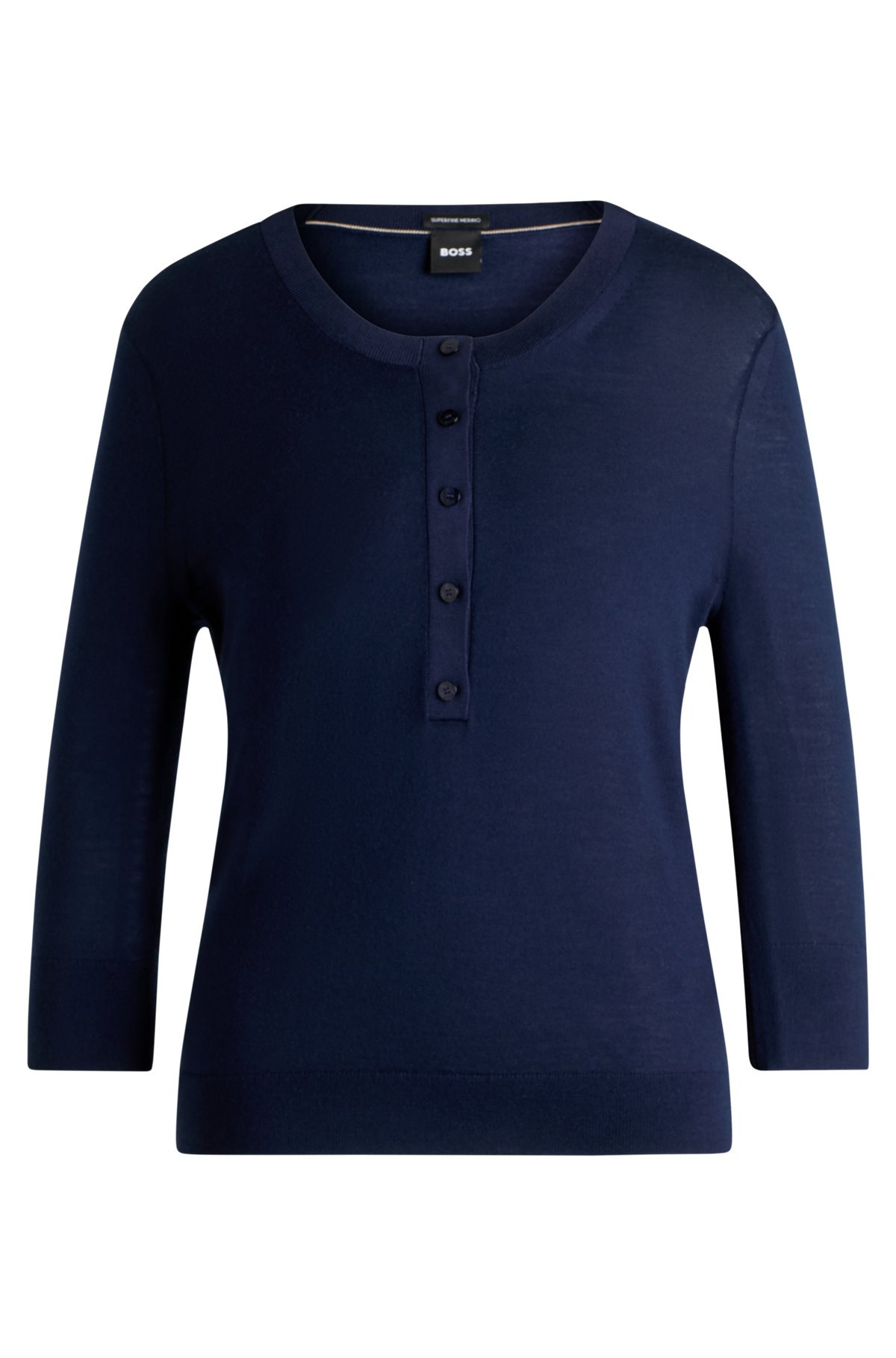 SIZE AND FIT The model wears a size S and is 5'10" tall with a, 31" chest, 24" waist and 35" hips. DETAILS Fiblure - 50530711 A feminine sweater with a super-soft feel by BOSS Womenswear. This elegant piece features an extended Henley neckline and three-quarter-length sleeves. Slim fit QUALITY & CARE INSTRUCTIONS Hand Wash Only Do Not Tumble Dry Quality: 100% Virgin wool, Collar: 87% materialcode.RVI, 12% Polyamid, 1% Elastane Do Not Bleach Iron Low Heat Reduced Dry Clean