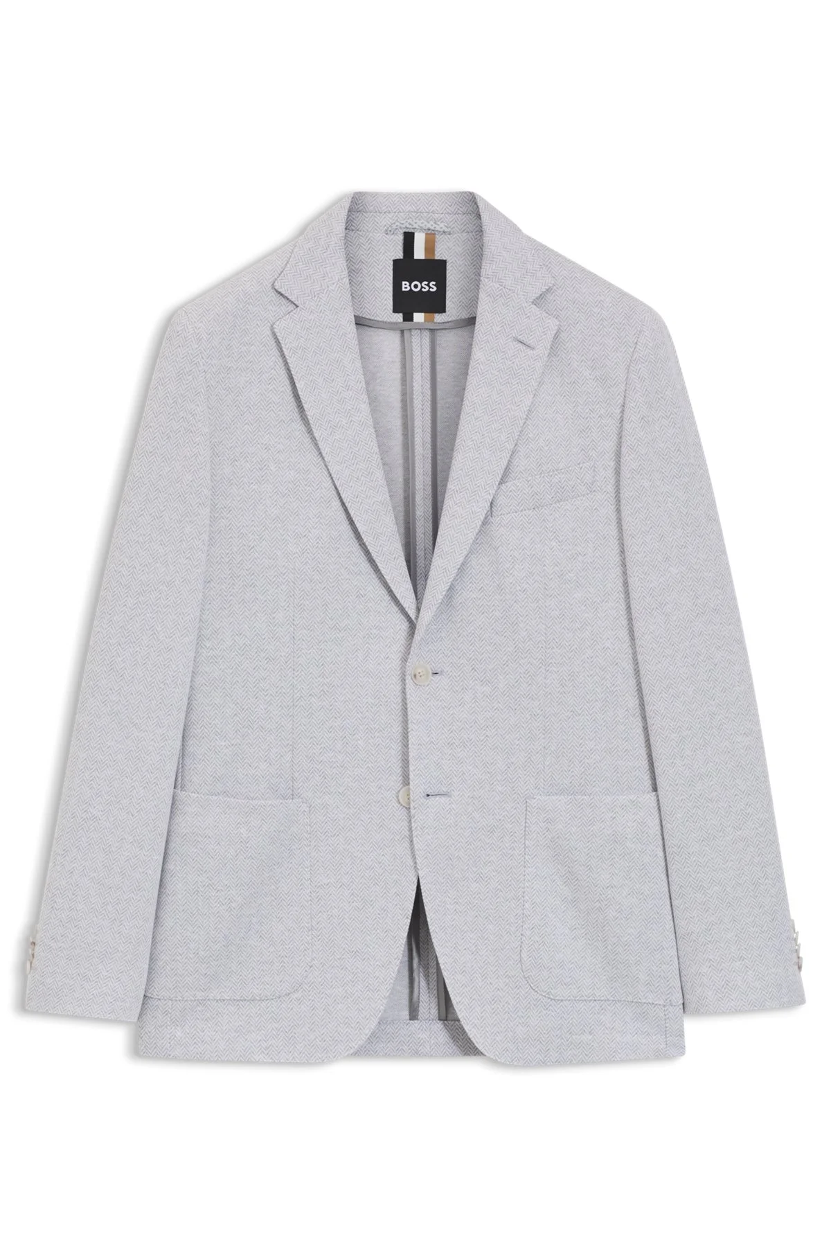 SIZE AND FIT The model wears a size 38R and is 6'1" tall with a, 36" chest, 29" waist and 36" hips. DETAILS Designed in cotton-rich jersey, this BOSS Menswear blazer has a classic herringbone weave that's easy to style. Regular fit with softly constructed shoulders. Regular fit Notched lapels Fastening top: Button closure Number of buttons: 2 Welt chest pockets Pockets top: Patch pockets Kissing buttons on the cuff Partially lined C-Jaye-J-241 - 50557389 QUALITY & CARE INSTRUCTIONS Iron Low Heat Do Not Bleach Material: 82% Cotton, 18% Polyester, Lining: 65% Polyester, 35% Cotton, Sleeve lining: 100% Viscose Do Not Wash Do Not Tumble Dry Reduced Dry Clean