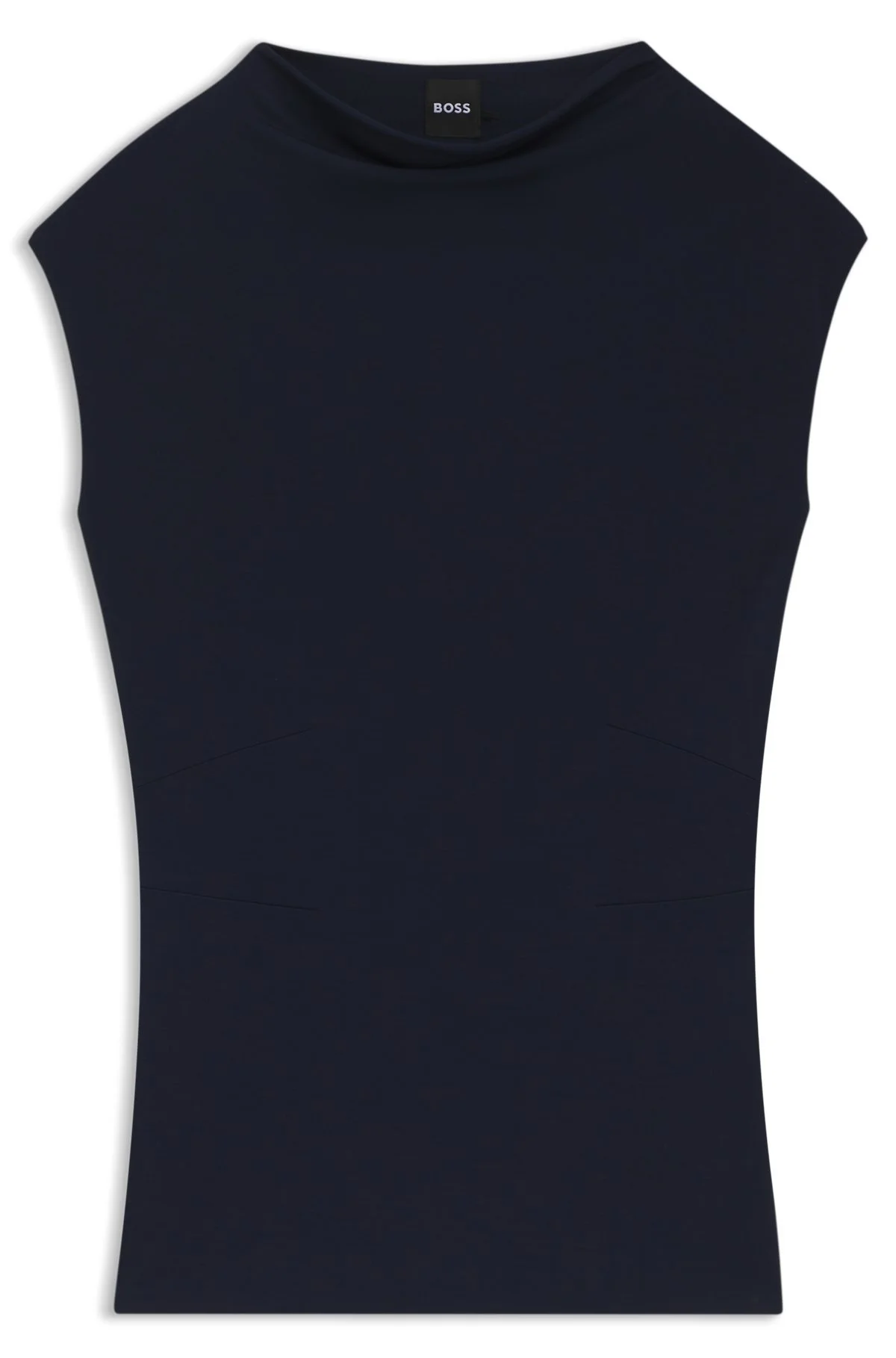 SIZE AND FIT The model wears a size S and is 5'10" tall with a, 31" chest, 23" waist and 35" hips. DETAILS Elamma - 50541896 In soft, breathable fabric, this BOSS Womenswear top has a matte finish for versatile styling. High neckline with draped effects. Slim fit Neckline: Turtleneck Cap sleeves QUALITY & CARE INSTRUCTIONS Do Not Tumble Dry Hand Wash Only Do Not Bleach Reduced Dry Clean Quality: 100% Viscose Iron Low Heat