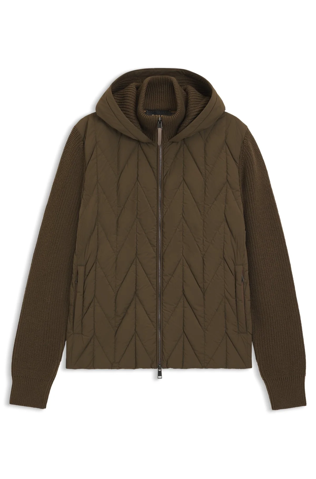 SIZE AND FIT The model wears a size M and is 6'1" tall with a, 36" chest, 29" waist and 36" hips. DETAILS Combining a soft wool knit with cozy down quilting, this hooded BOSS Menswear jacket will become a daily favorite. Straight fit. Regular fit Ribbed cuffs Standard length L-Upton - 50555211 QUALITY & CARE INSTRUCTIONS Reduced Dry Clean Do Not Tumble Dry Do Not Wash Iron Low Heat Material: 100% Virgin wool, Lining: 100% Polyester, Filling: 90% Duck down, 10% Duck Feather, Front panel: 86% Polyamid, 14% Elastane Do Not Bleach