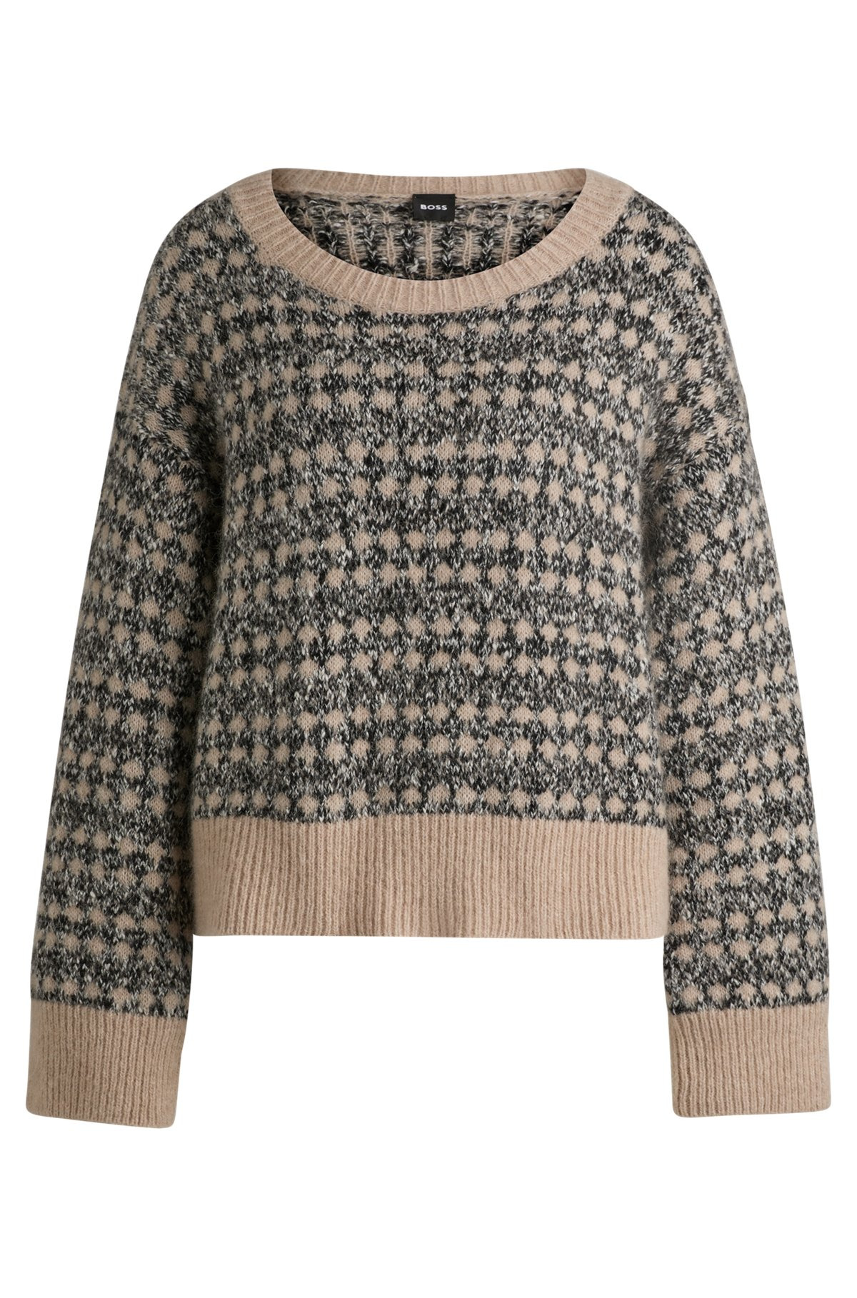 DETAILS Fernade - 50523729 A luxurious sweater by BOSS, knitted in three-colored yarns with a jacquard structure. This layer is blended with alpaca and a touch of cotton. Neckline: Crew neck Long sleeves QUALITY & CARE INSTRUCTIONS Hand Wash Only Quality: 41% Alpaca, 37% Polyamid (32% recycled), 16% Cotton, 6% Polyester, Ribbing: 50% Alpaca, 50% Polyamide Do Not Tumble Dry Do Not Bleach Iron Low Heat Reduced Dry Clean