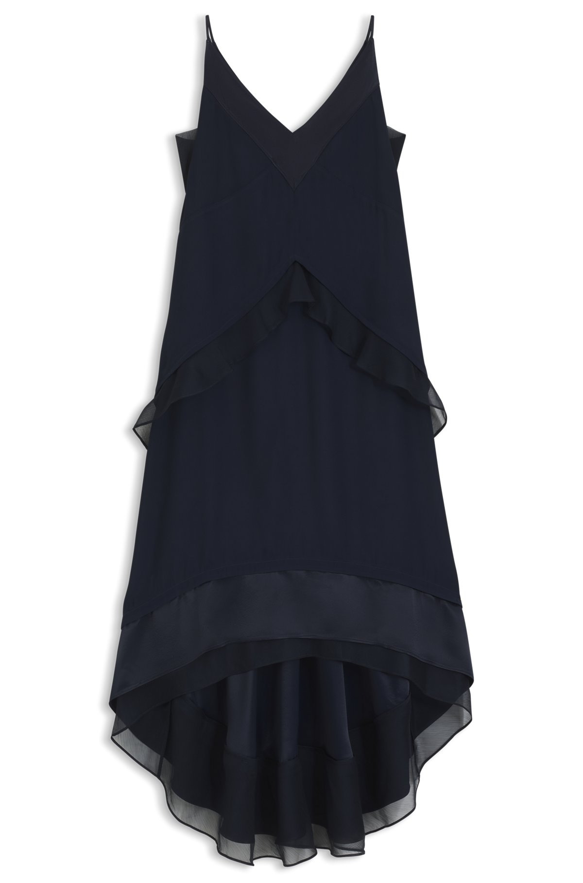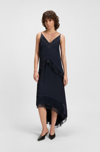 SIZE AND FIT The model wears a size 2 and is 5'9" tall with a, 31" chest, 24" waist and 35" hips. DETAILS Dekalya - 50542856 Slip into this BOSS Womenswear dress for instant elegance. With its floaty layers, this loose-fitting dress has tonal silk trims for a luxurious touch. Relaxed fit Neckline: V-neck Fastening top: Zip and hook closure Sleeveless Fit back length: 125 cm (49 inches) QUALITY & CARE INSTRUCTIONS Do Not Tumble Dry Quality: 100% Viscose, Lining: 100% Polyester, Top: 100% Viscose, Insert: 100% Polyester Reduced Dry Clean Iron Low Heat Do Not Wash Do Not Bleach