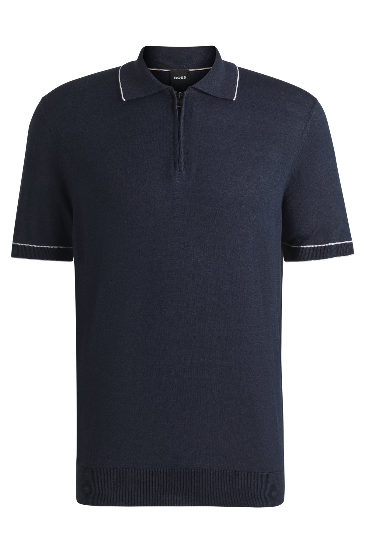 SIZE AND FIT The model wears a size M and is 6'2" tall with a, 33" chest, 27" waist and 35" hips. DETAILS H-Jiovanotto - 50537640 With tipping and a sporty zip placket, this BOSS Menswear sweater is a casual must. Cut to a straight fit in a summery blend. Regular fit Neckline: Zip neck Short sleeves Standard length QUALITY & CARE INSTRUCTIONS Cold, gentle machine wash; reduced spin speed. Do Not Tumble Dry Quality: 56% Linen, 44% Viscose (10% recycled) Reduced Dry Clean Iron Low Heat Do Not Bleach