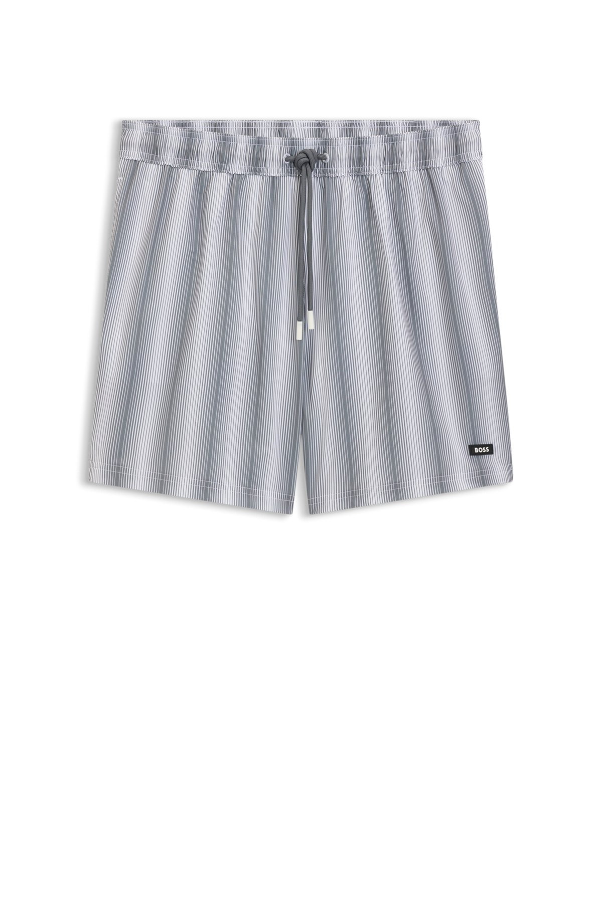 SIZE AND FIT The model wears a size M and is 6'2" tall with a, 36" chest, 31" waist and 38" hips. DETAILS Update your collection with the fresh stripes of these BOSS Menswear swim shorts. Naturally quick drying and trimmed with a subtle logo badge. Drawstring waist. Elastic waistband Pockets bottom front: Side pockets Pockets bottom back: Patch pocket Short length Flounder - 50554983 QUALITY & CARE INSTRUCTIONS Do Not Bleach Do Not Iron Machine Wash Cold Do Not Dry Clean Do Not Tumble Dry Material: 56% Polyester, 44% Elastomultiester, Lining: 100% Polyester