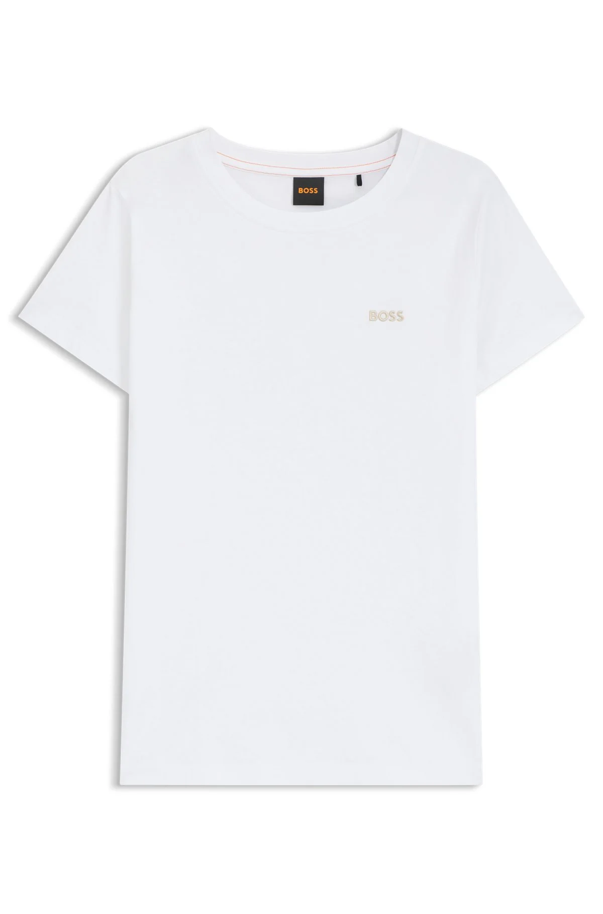 SIZE AND FIT The model wears a size S and is 5'9" tall with a, 32" chest, 23" waist and 33" hips. DETAILS With its straight fit and subtle logo detail, this BOSS Womenswear T-shirt will become a daily favorite. Crafted in soft, breathable cotton. Regular fit Neckline: Crew neck Short sleeves Standard length C_Esogo_1 - 50506973 QUALITY & CARE INSTRUCTIONS Material: 100% Cotton Machine Wash Cold Gentle Do Not Bleach Do Not Tumble Dry Do Not Dry Clean Iron Low Heat