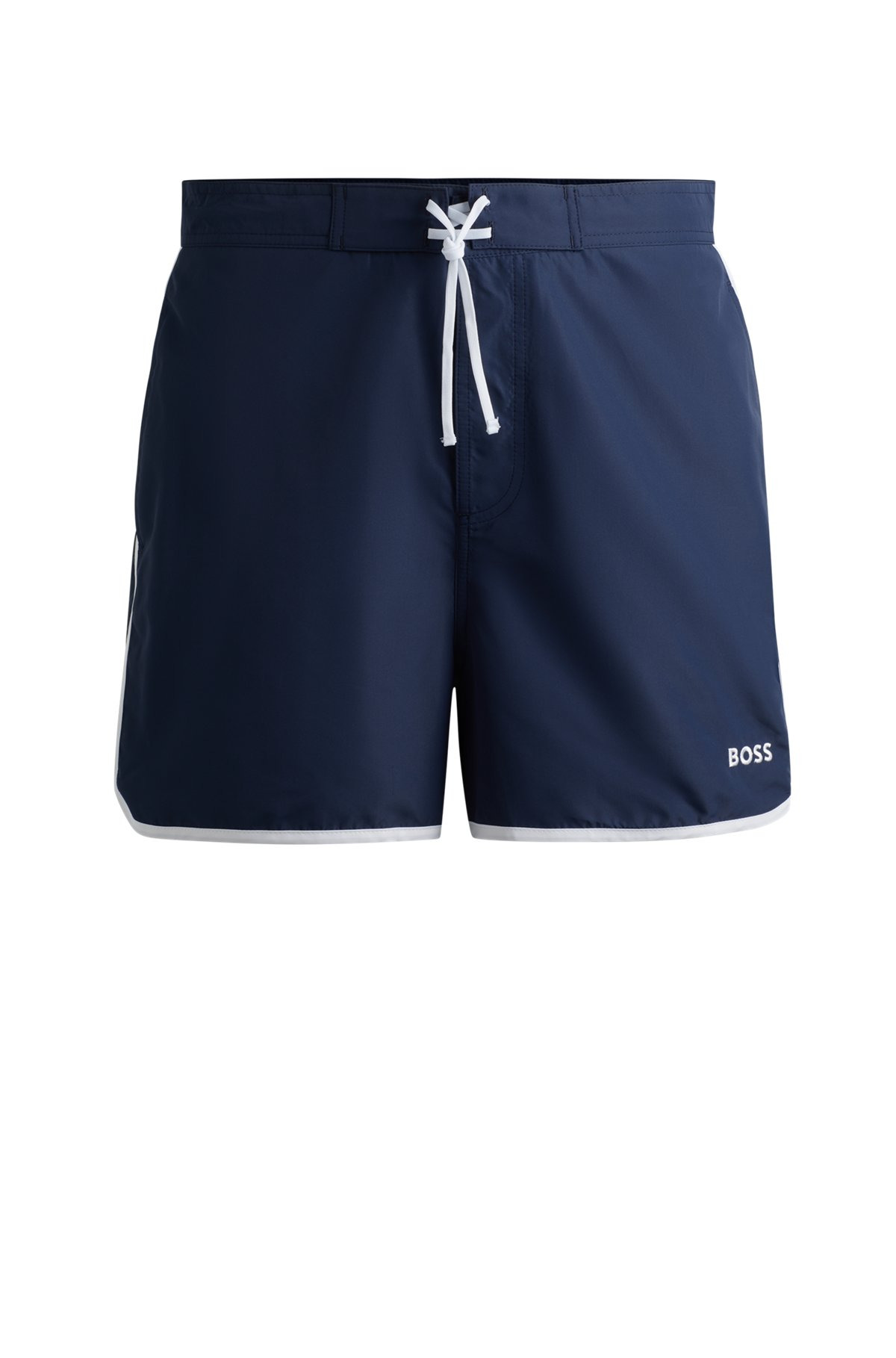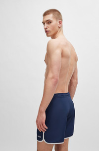 SIZE AND FIT The model wears a size M and is 6'2" tall with a, 38" chest, 31" waist and 37" hips. DETAILS Luna - 50518927 Sporty swim shorts with full lining by BOSS. Featuring contrast piping, this quick-drying pair is embroidered with a BOSS logo. This product is created with polyester. QUALITY & CARE INSTRUCTIONS Do Not Bleach Do Not Tumble Dry Machine Wash Cold Do Not Dry Clean Iron Low Heat Quality: 100% Polyester, Lining: 100% Polyester