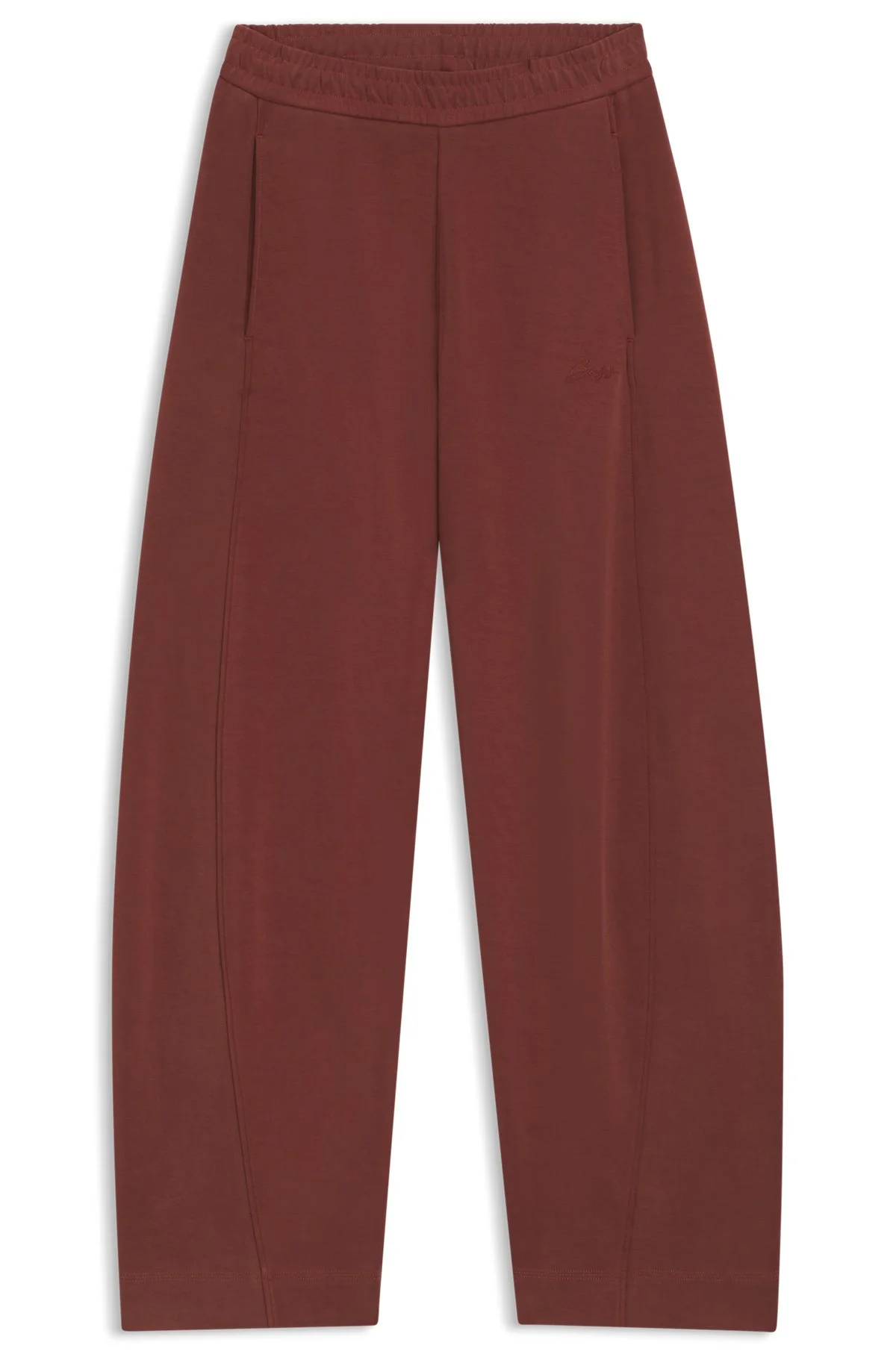 SIZE AND FIT Relaxed fit The model wears a size S and is 5'9" tall with a, 30" chest, 23" waist and 35" hips. DETAILS Create modern casual looks with the balloon-leg profile of these BOSS Womenswear tracksuit bottoms. Soft stretch blend. Embroidered handwritten logo. In-seam front pockets. Relaxed fit Regular rise Elastic Waistband Pockets bottom front: Side pockets C_Eluxey - 50553457 QUALITY & CARE INSTRUCTIONS Iron Low Heat Do Not Tumble Dry Do Not Bleach Material: 52% Modal, 46% Polyester, 2% Elastane, pocketing: 100% Cotton Cold, gentle machine wash; reduced spin speed. Do Not Dry Clean