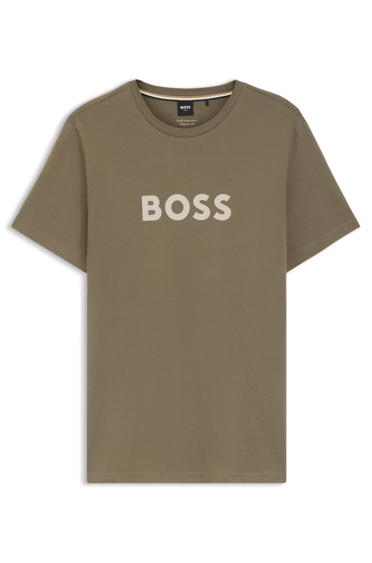 DETAILS Hit the beach in style with the large logo print and comfy cotton of this BOSS Menswear T-shirt. Cut to an easy regular fit. Regular fit Neckline: Crew neck T-Shirt RN - 50491706 QUALITY & CARE INSTRUCTIONS Iron Low Heat Do Not Bleach Machine Wash Cold Do Not Tumble Dry Material: 100% Cotton Do Not Dry Clean