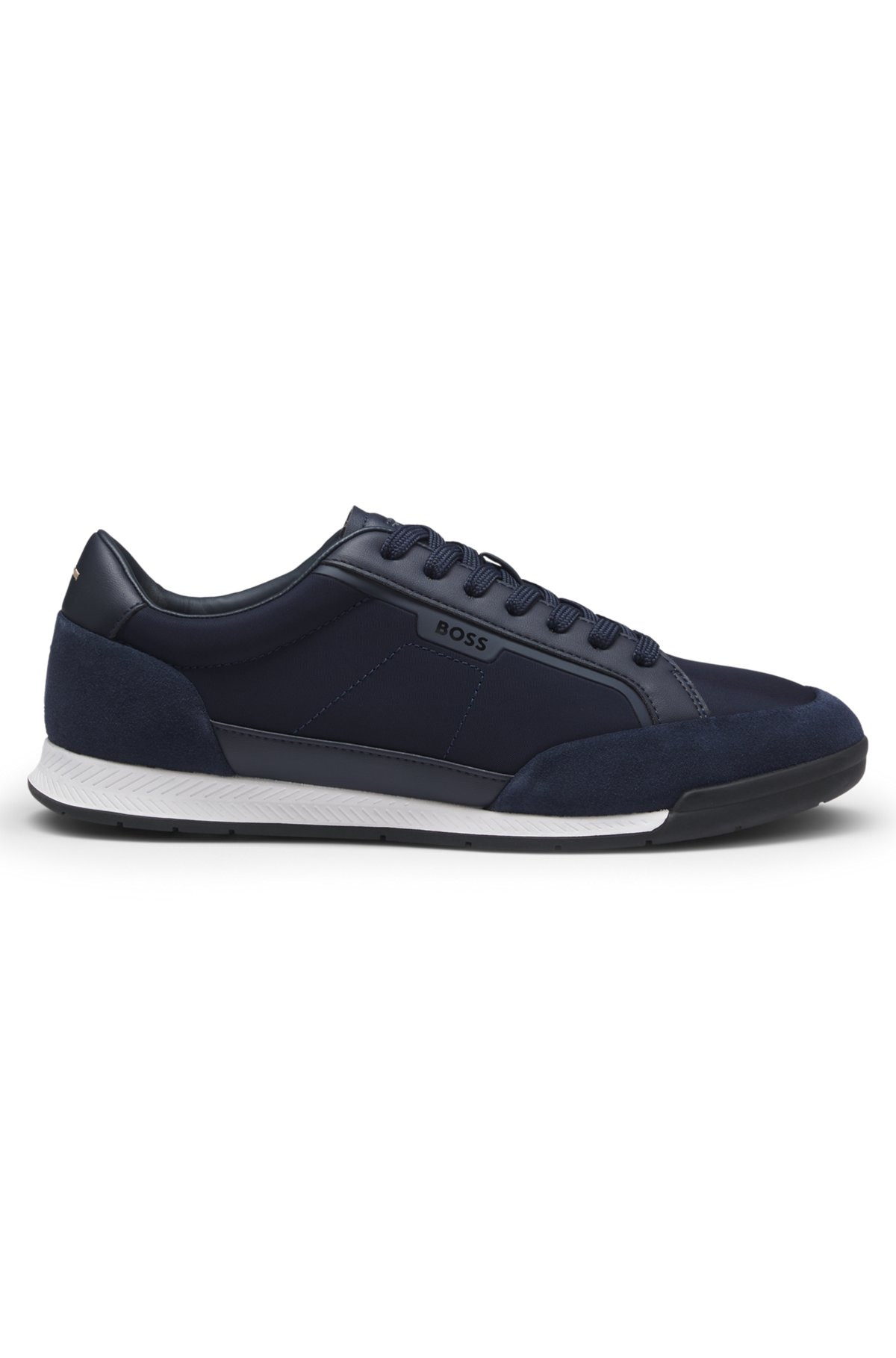 DETAILS Nitan_txsd - 50548864 With subtle logo details, these BOSS Menswear trainers are an easy option for everyday wear. Mix of suede and synthetic coated fabric. Synthetic coated fabric, sometimes referred to as faux leather, is a fabric designed to resemble real leather, and/or display a matte, glossy, smooth, or textured, coated appearance. Laces Fully lined Packaging: Box QUALITY & CARE INSTRUCTIONS Upper material: 100% Polyester, Lining: 100% Polyester, 85% Polyester, 60% Polyurethane, 40% Polyester, 15% Polyurethane, Sole: 100% Rubber, Facing: 100% Cow leather, 60% Polyurethane, 40% Polyester, Innersole: 100% Polyester