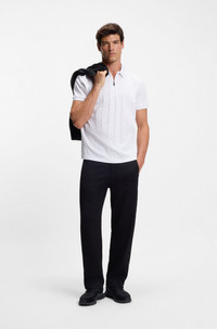 DETAILS Upgrade your active options with the moisture-managing mercerized cotton of this BOSS Menswear polo shirt. Dynamic jacquard pattern. Sporty zip placket. Relaxed fit. Relaxed fit Neckline: Flat-knit collar Fastening top: Zip closure Short sleeves Flat-knit cuffs Standard length PL_Mirror QZ - 50548653 QUALITY & CARE INSTRUCTIONS Do Not Tumble Dry Iron Low Heat Do Not Dry Clean Machine Wash Cold Gentle Do Not Bleach Quality: 100% Cotton