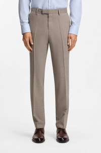 SIZE AND FIT The model wears a size 38R and is 6'1" tall with a, 37" chest, 29" waist and 35" hips. DETAILS Give your formal rotation some fresh input with this two-piece BOSS Menswear suit. Tailored to a modern streamlined fit, this suit is crafted in performance-stretch cloth with virgin wool for easy movement with a rich look. Constructed shoulders and notch lapels underline the contemporary cut. Slim fit Notched lapels Fastening top: Button closure Number of buttons: 2 Welt chest pockets Pockets top: Flap pockets Kissing buttons on the cuff Fully lined Hook and zip closure Pockets bottom front: Side slash pockets Pockets bottom back: Jetted pockets H-Huge-2Pcs-253 - 50557252 QUALITY & CARE INSTRUCTIONS Do Not Wash Reduced Dry Clean Material: 54% Polyester, 44% Virgin wool, 2% Elastane, Lining: 95% Polyester, 5% Elastane, Sleeve lining: 100% Viscose, knee lining: 100% Viscose Do Not Tumble Dry Do Not Bleach Iron Low Heat