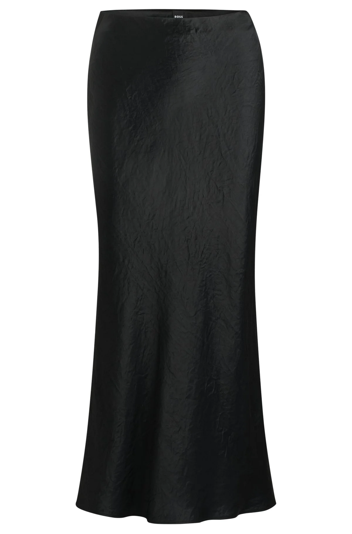 DETAILS Vesatie - 50524006 A midi skirt by BOSS. Fitted at the hips for a flattering effect, this piece is crafted in satin-touch fabric with a crinkled texture. High rise A-line skirt Long length Fit back length: 89 cm (35 inches) QUALITY & CARE INSTRUCTIONS Cold, gentle machine wash; reduced spin speed. Quality: 100% Acetate Do Not Tumble Dry Do Not Bleach Iron Low Heat Reduced Dry Clean